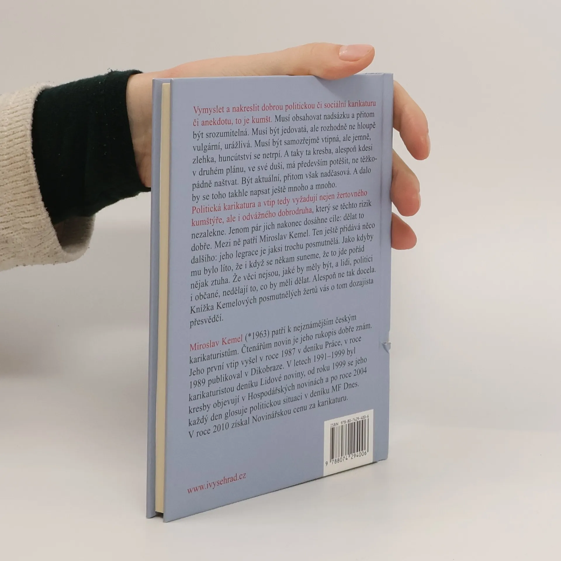 Karikatury Miroslava Kemela každý den v MF Dnes. Vymyslet a nakreslit dobrou politickou či sociální karikaturu či anekdotu, to je kumšt. Musí obsahovat nadsázku a přitom být srozumitelná. Musí být jedovatá, ale rozhodně ne hloupě vulgární, urážlivá. Musí být samozřejmě vtipná, ale jemně, zlehka, huncútství se netrpí. A taky ta kresba, alespoň kdesi v druhém plánu, ve své duši, má především potěšit, ne těžkopádně naštvat. Být aktuální, přitom však nadčasová. A dalo by se toho takhle napsat ještě mnoho a mnoho. Politická karikatura a vtip tedy vyžadují nejen žertovného kumštýře, ale i odvážného dobrodruha, který se těchto rizik nezalekne. Jenom pár jich nakonec dosáhne cíle: dělat to dobře. Mezi ně patří Miroslav Kemel. Ten ještě přidává něco dalšího: jeho legrace je jaksi trochu posmutnělá. Jako kdyby mu bylo líto, že i když se někam suneme, že to jde pořád nějak ztuha. Že věci nejsou, jaké by měly být, a lidi, politici i občané, nedělají to, co by měli dělat. Alespoň ne tak docela. Knížka Kemelových posmutnělých žertů vás o tom dozajista přesvědčí.