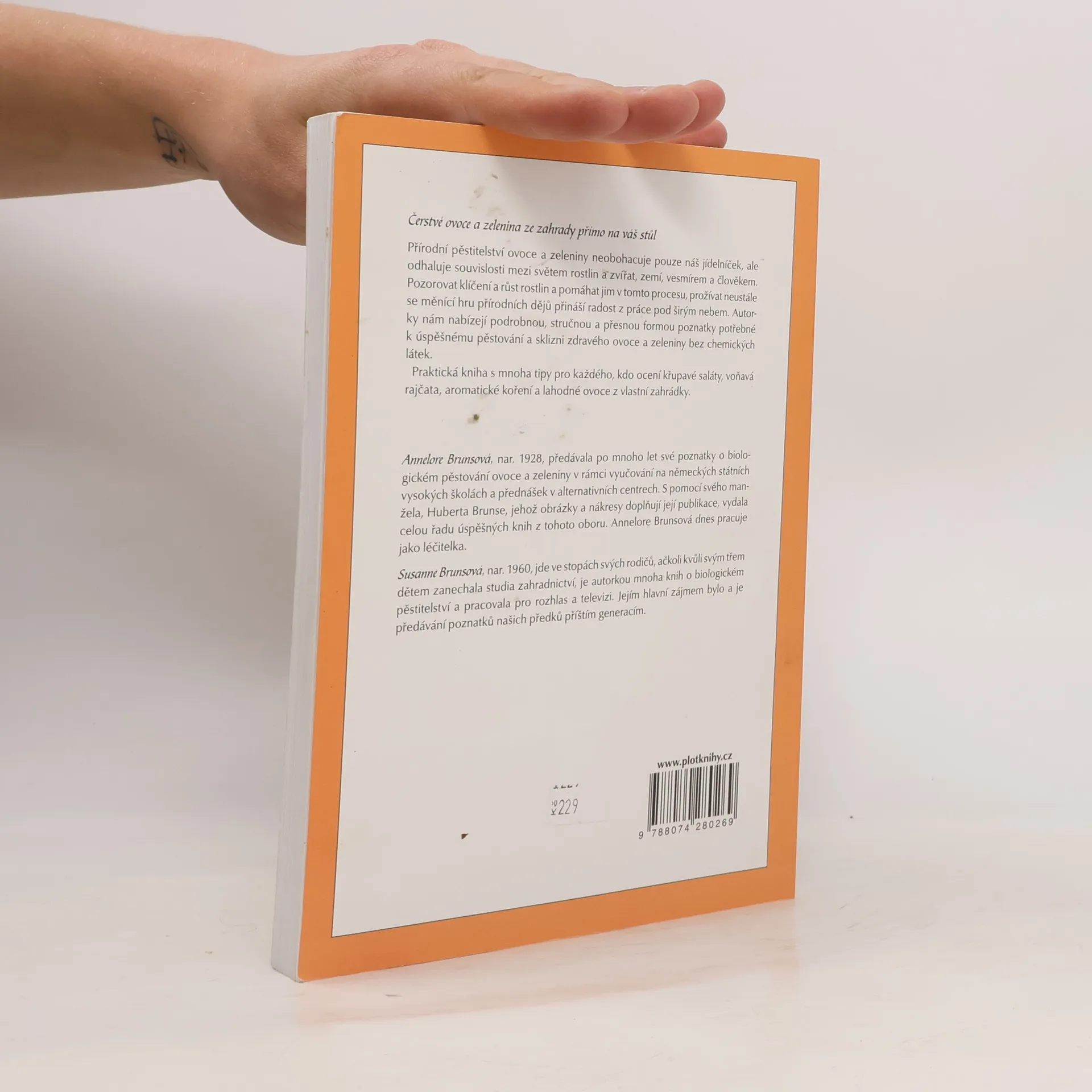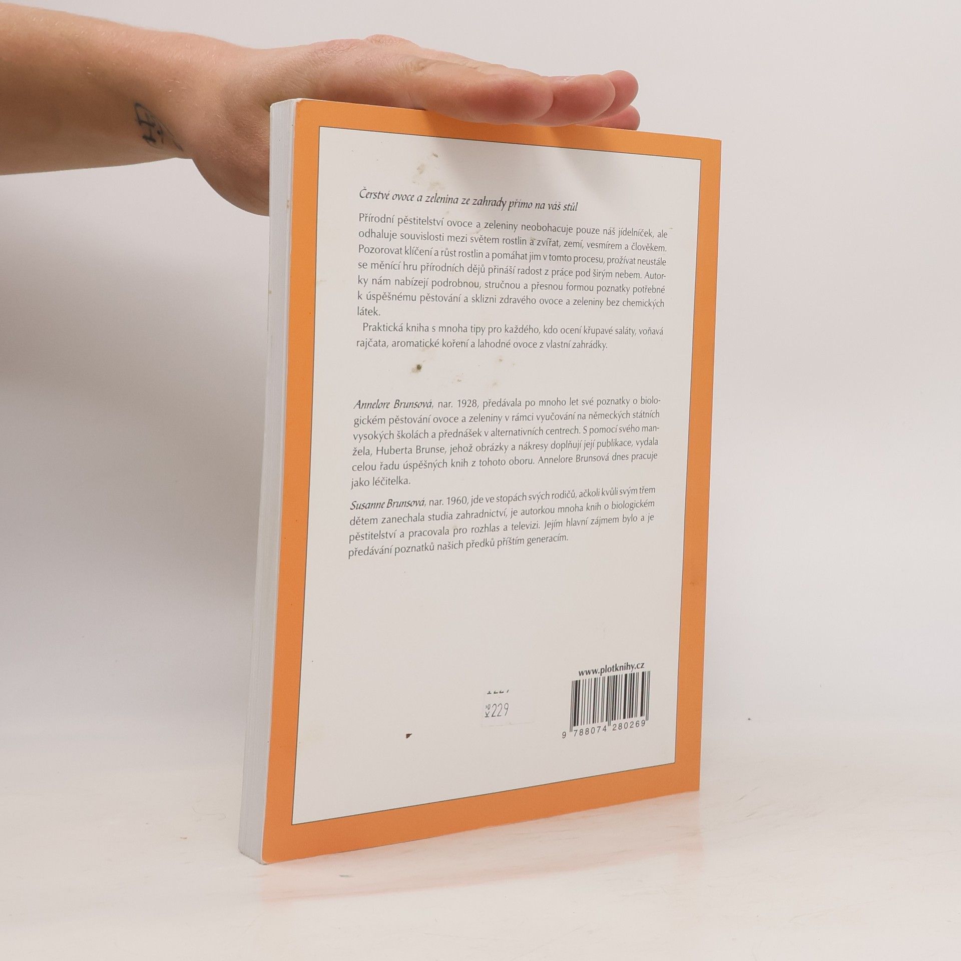 Čerstvé ovoce a zelenina ze zahrady přímo na váš stůl Přírodní pěstitelství ovoce a zeleniny neobohacuje pouze náš jídelníček, ale odhaluje souvislosti mezi světem rostlin a zvířat, zemí, vesmírem a člověkem. Pozorovat klíčení a růst rostlin a pomáhat jim v tomto procesu, prožívat neustále se měnící hru přírodních dějů přináší radost z práce pod širým nebem. Autorky nám nabízejí podrobnou, stručnou a přesnou formou poznatky potřebné k úspěšnému pěstování a sklizni zdravého ovoce a zeleniny bez chemických látek. Praktická kniha s mnoha tipy pro každého, kdo ocení křupavé saláty, voňavá rajčata, aromatické koření a lahodné ovoce z vlastní zahrádky. Annelore Brunsová, nar. 1928, předávala po mnoho let své poznatky o biologickém pěstování ovoce a zeleniny v rámci vyučování na německých státních vysokých školách a přednášek v alternativních centrech. S pomocí svého manžela, Huberta Brunse, jehož obrázky a nákresy doplňují její publikace, vydala celou řadu úspěšných knih z tohoto oboru. Annelore Brunsová dnes pracuje jako léčitelka. Susanne Brunsová, nar. 1960, jde ve stopách svých rodičů, ačkoli kvůli svým třem dětem zanechala studia zahradnictví, je autorkou mnoha knih o biologickém pěstitelství a pracovala pro rozhlas a televizi. Jejím hlavní zájmem bylo a je předávání poznatků našich předků příštím generacím.