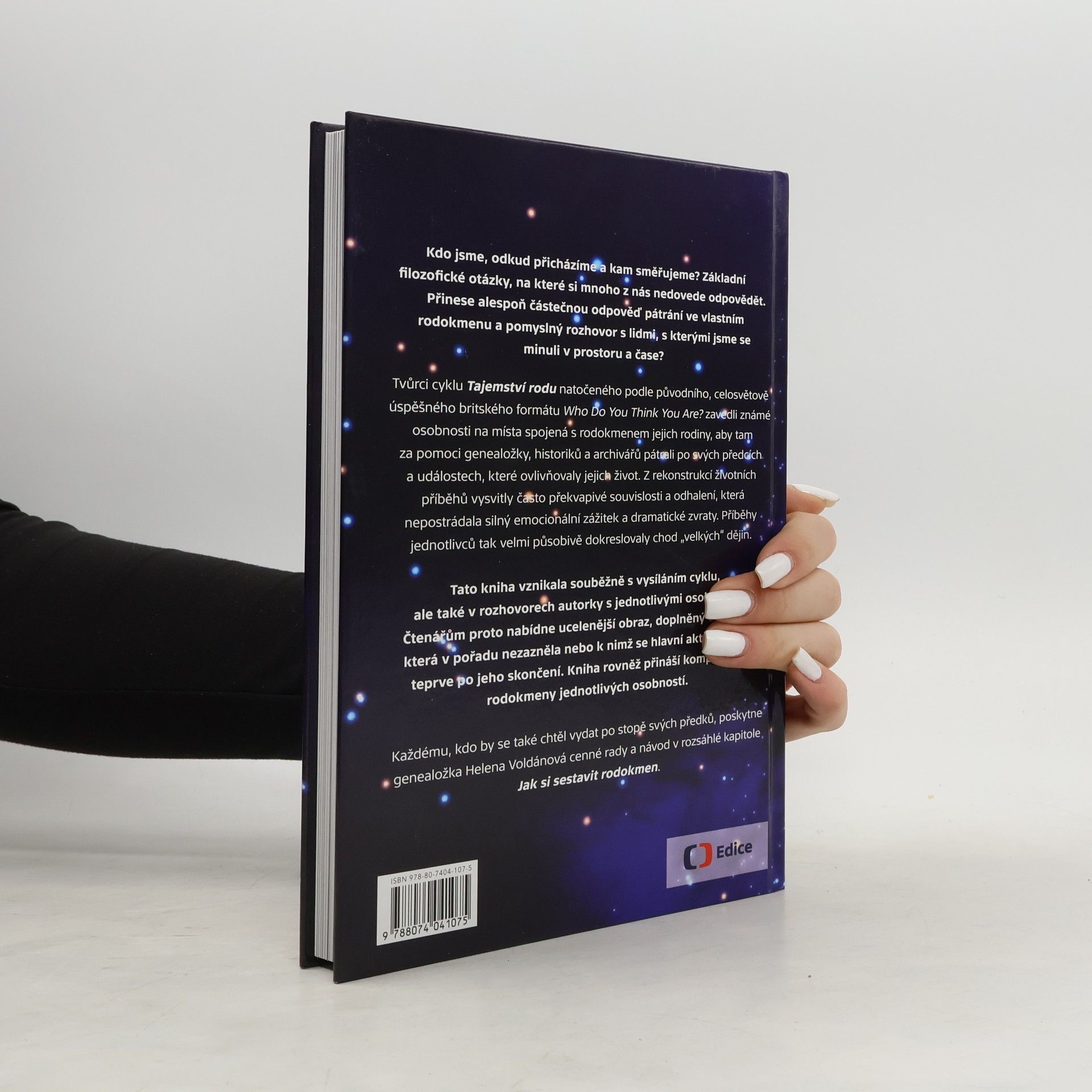 Kdo jsme, odkud přicházíme a kam směřujeme? Tyto základní filozofické otázky často zůstávají bez odpovědi. Pátrání v rodokmenu a imaginární rozhovory s lidmi z minulosti mohou přinést alespoň částečné odpovědi. Tvůrci cyklu Tajemství rodu, inspirovaného britským formátem Who Do You Think You Are?, vedou známé osobnosti na místa spojená s jejich rodinou, kde za pomoci genealožky a historiků objevují své předky a události, které ovlivnily jejich životy. Rekonstrukce životních příběhů odhalují překvapivé souvislosti a dramatické zvraty, které osvětlují "velké" dějiny. Kniha vznikala souběžně s cyklem a zahrnuje rozhovory autorky s jednotlivými osobnostmi, čímž nabízí ucelenější pohled a doplňuje informace, které v pořadu nezazněly. Obsahuje také kompletní rodokmeny jednotlivých osobností. Pro ty, kteří chtějí pátrat po svých předcích, poskytuje genealožka Helena Voldánová cenné rady v kapitole Jak si sestavit rodokmen. Mezi osobnostmi vystupujícími v cyklu a knize jsou Karel Šíp, Michal Viewegh, Květa Fialová, Viktor Preiss, Ester Janečková a další. Kniha v češtině představuje celosvětové prvenství, neboť dosud nebyla vydána v jiném než anglickém jazyce, a to i s ohledem na národní verze cyklu.