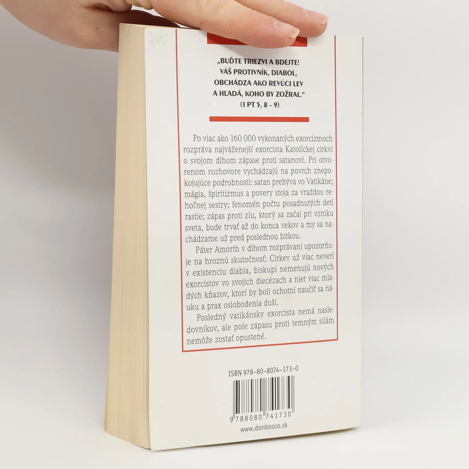 „BUĎTE TRIEZVI A BDEJTE! VÁŠ PROTIVNÍK, DIABOL, OBCHÁDZA AKO REVÚCI LEV A HĽADÁ, KOHO BY ZOŽRAL.” (1 PT 5, 8 – 9) Po viac ako 160 000 vykonaných exorcizmoch rozpráva najváženejší exorcista Katolíckej cirkvi o svojom dlhom zápase proti satanovi. Pri otvorenom rozhovore vychádzajú na povrch znepokojujúce podrobnosti: satan prebýva vo Vatikáne; mágia, špiritizmus a povery stoja za vraždou rehoľnej sestry; fenomén počtu posadnutých detí rastie; zápas proti zlu, ktorý sa začal pri vzniku sveta, bude trvať až do konca vekov a my sa nachádzame už pred poslednou bitkou. Páter Amorth v dlhom rozprávaní upozorňuje na hroznú skutočnosť: Cirkev už viac neverí v existenciu diabla, biskupi nemenujú nových exorcistov vo svojich diecézach a niet viac mladých kňazov, ktorí by boli ochotní naučiť sa náuku a prax oslobodenia duší. Posledný vatikánsky exorcista nemá nasledovníkov, ale pole zápasu proti temným silám nemôže zostať opustené.