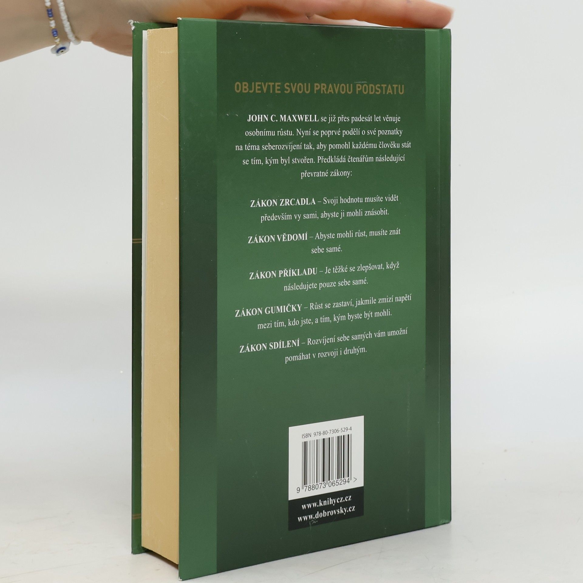 Žijte podle nich a naplňte svůj potenciál / John Maxwell se již přes 50 let věnuje osobnímu růstu. Nyní se se čtenáři poprvé podělí o své poznatky na téma seberozvíjení tak, aby napomohl čtenáři stát se tím, kým byl stvořen. Svým jedinečným způsobem učí John Maxwell své čtenáře následujícím zákonům: Zákon zrcadla: Svoji hodnotu musíte vidět především vy sami, abyste ji mohli znásobit Zákon vědomí: Abyste mohli růst, musíte znát sami sebe Zákon příkladu: Je těžké se zlepšovat, když následujete pouze sami sebe Zákon gumičky: Růst se zastaví, jakmile zmizí napětí mezi tím, kdo jste, a tím, kým byste být mohli Zákon sdílení: Rozvíjení sebe sama vám umožní pomáhat v rozvoji i druhým Třetí a poslední kniha série (následující po bestselleru o dvou milionech prodaných výtisků, 21 nevyvratitelných zákonů vůdcovství a 17 nepopiratelných zákonů týmové práce) napomůže čtenáři, aby se dokázal rozvíjet po celý život a neustále naplňoval svůj nevyčerpatelný životní potenciál.