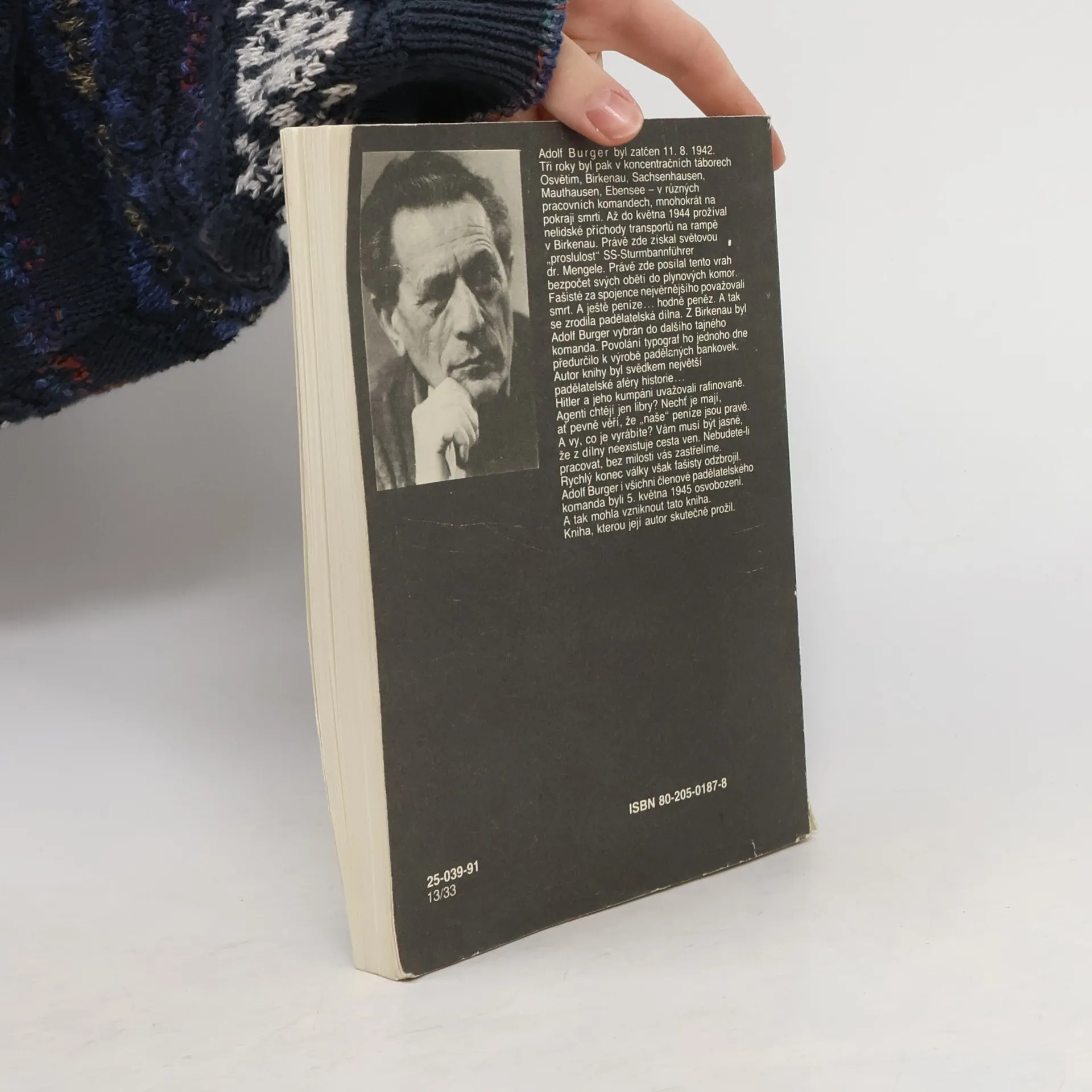 Největší padělatelská operace všech dob Autobiografický příběh muže, který jako vězeň několika nacistických koncentračních táborů byl donucen vyrábět padělky peněz pro Německo. Autobiografické vzpomínky A. Burgera, vězně nacistických koncentračních táborů. Autor byl vyučený sazeč. V roce 1942 byl odvlečen se svou ženou ze Žiliny do koncentračního tábora Osvětim. V první části vzpomínek popisuje otřesné poměry a život v Osvětimi a Březince i různé způsoby likvidace vězňů. Jeho žena v táboře zahynula, kdežto A. Burger byl jako knihtiskař a sazeč převezen do Sachsenhausenu, kde byl nucen pracovat v nacistické padělatelské dílně. Zde vznikly padělky liber v mnohamilionové hodnotě, padělky známek i jiných dokumentů. Z tohoto tábora vedla cesta padělatelské skupiny přes Mauthausen až do Ebensee, kde se dočkali osvobození. Po válce byly padělky vyloveny z jezera Toplitz-see, kde je nacisté ukryli. (méně textu)