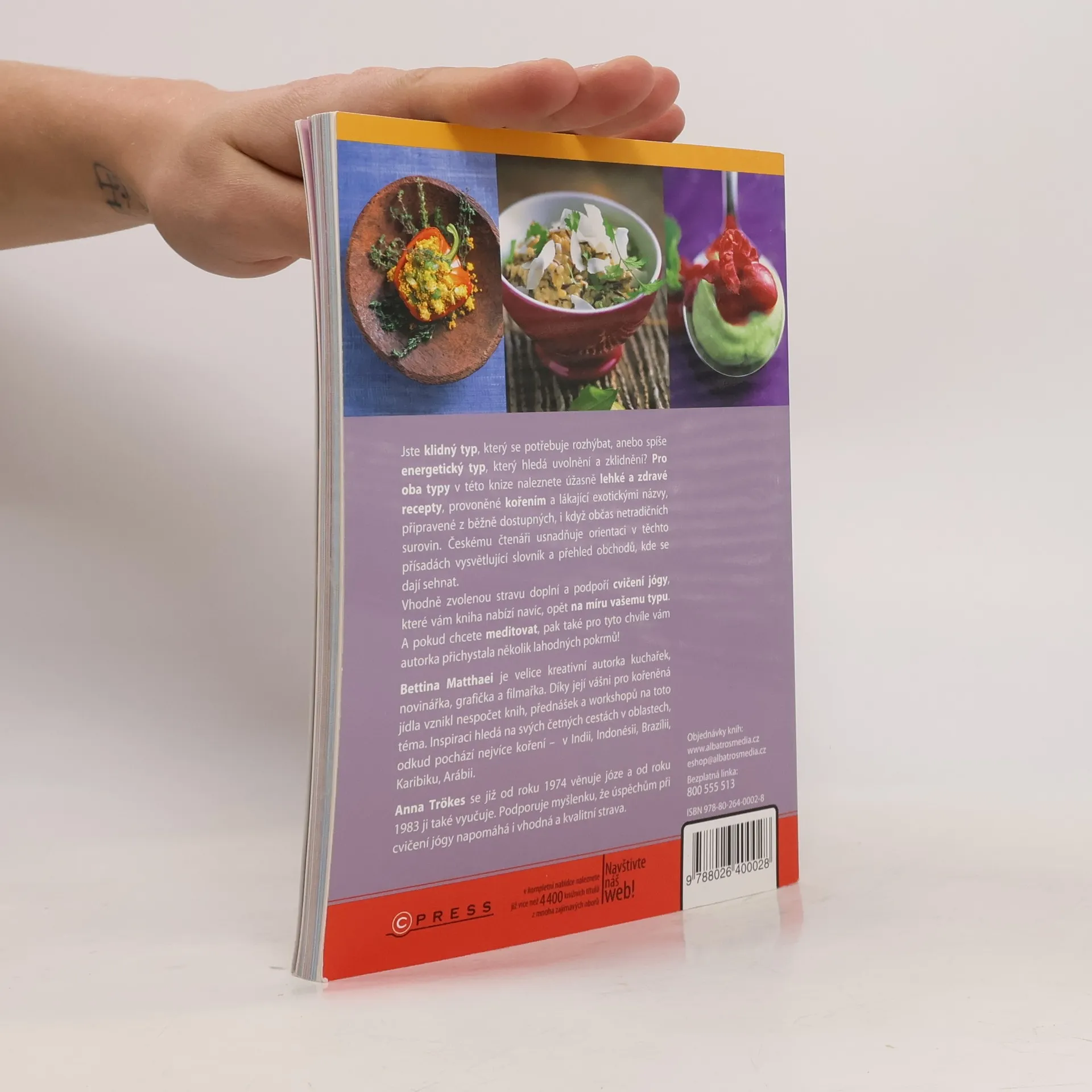 Jste klidný typ, který se potřebuje rozhýbat, anebo spíše energetický typ, který hledá uvolnění a zklidnění? Pro oba typy v této knize naleznete úžasně lehké a zdravé recepty, provoněné kořením a lákající exotickými názvy, připravené z běžně dostupných, i když občas netradičních surovin. Českému čtenáři usnadňuje orientaci v těchto přísadách vysvětlující slovník a přehled obchodů, kde se dají sehnat. Vhodně zvolenou stravu doplní a podpoří cvičení jógy, které vám kniha nabízí navíc, opět na míru vašemu typu. A pokud chcete meditovat, pak také pro tyto chvíle vám autorka přichystala několik lahodných pokrmů! Bettina Matthaei je velice kreativní autorka kuchařek, novinářka, grafička a filmařka. Díky její vášni pro kořeněná jídla vznikl nespočet knih, přednášek a workshopů na toto téma. Inspiraci hledá na svých četných cestách v oblastech, odkud pochází nejvíce koření – v Indii, Indonésii, Brazílii, Karibiku, Arábii. Anna Trökes se již od roku 1974 věnuje józe a od roku 1983 ji také vyučuje. Podporuje myšlenku, že úspěchům při cvičení jógy napomáhá i vhodná a kvalitní strava.