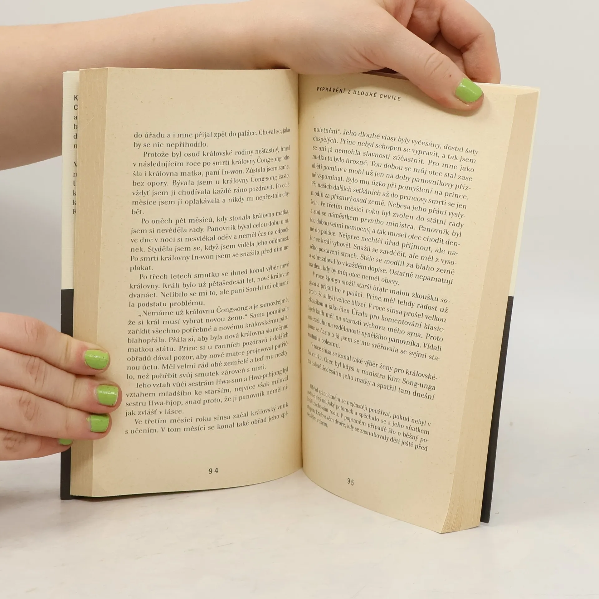 Příběh královny In-hjon z počátku 17. století a deník nešťastné princezny Hong, jejíž šílený manžel byl z rozkazu vlastního otce krutým způsobem usmrcen, dají čtenáři nahlédnout do zákulisí korejského panovnického dvora v 17. a 18. století.