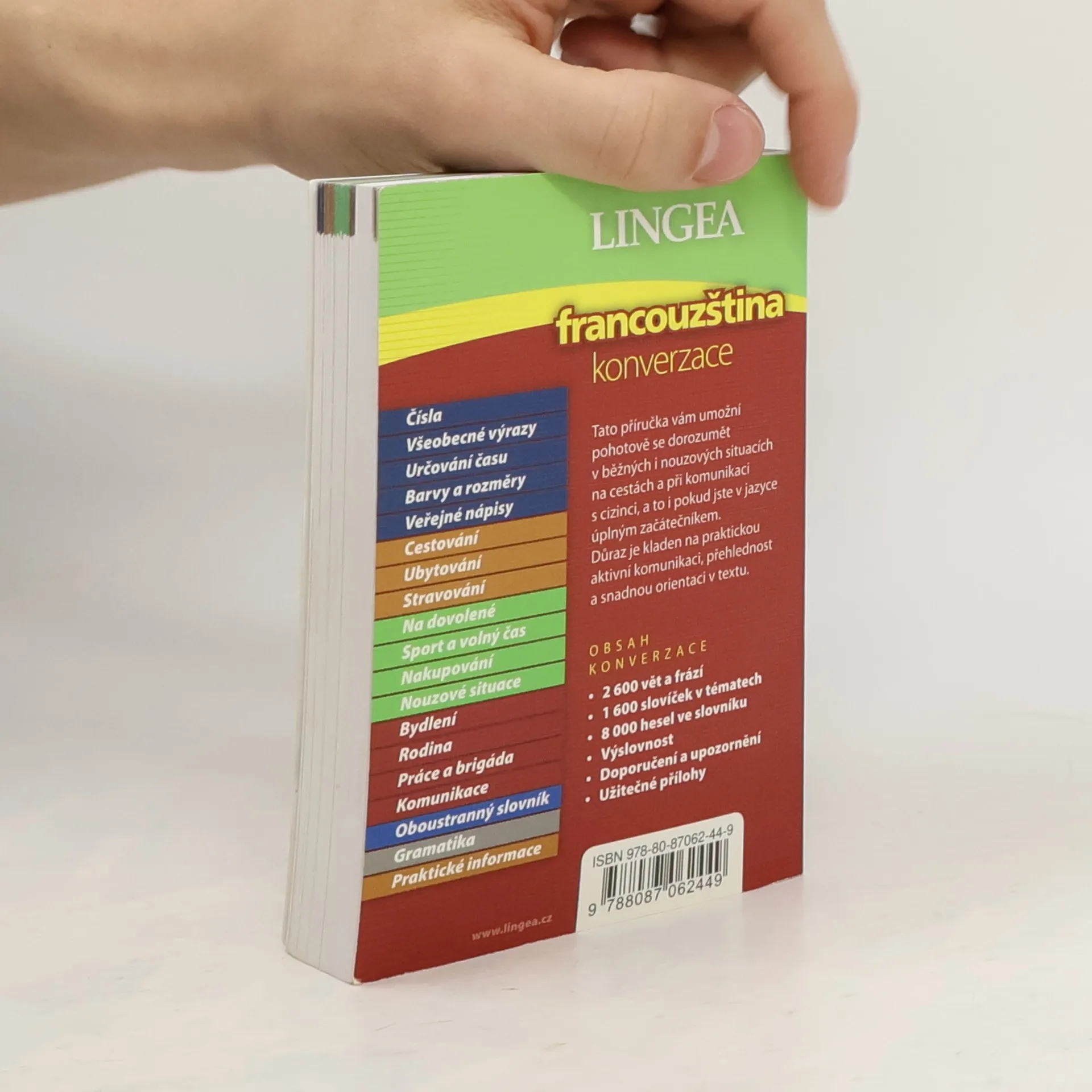 Tato příručka vám umožní pohotově se dorozumět v běžných i nouzových situacích na cestách a při komunikaci s cizinci, a to i pokud jste v jazyce úplným začátečníkem. Důraz je kladen na praktickou aktivní komunikaci, přehlednost a snadnou orientaci v textu. Obsah konverzace: 2600 vět a frází, 1600 slovíček v tématech, 8000 hesel ve slovníku, výslovnost, doporučení a upozornění, užitečné přílohy. V konverzaci najdete: Čísla, Všeobecné výrazy, Určování času, Barvy a rozměry, Veřejné nápisy, Cestování, Ubytování, Stravování, Na dovolené, Sport a volný čas, Nakupování, Nouzové situace, Bydlení, Rodina, Práce a brigáda, Komunikace, Oboustranný slovník, Gramatika, Praktické inofrmace.