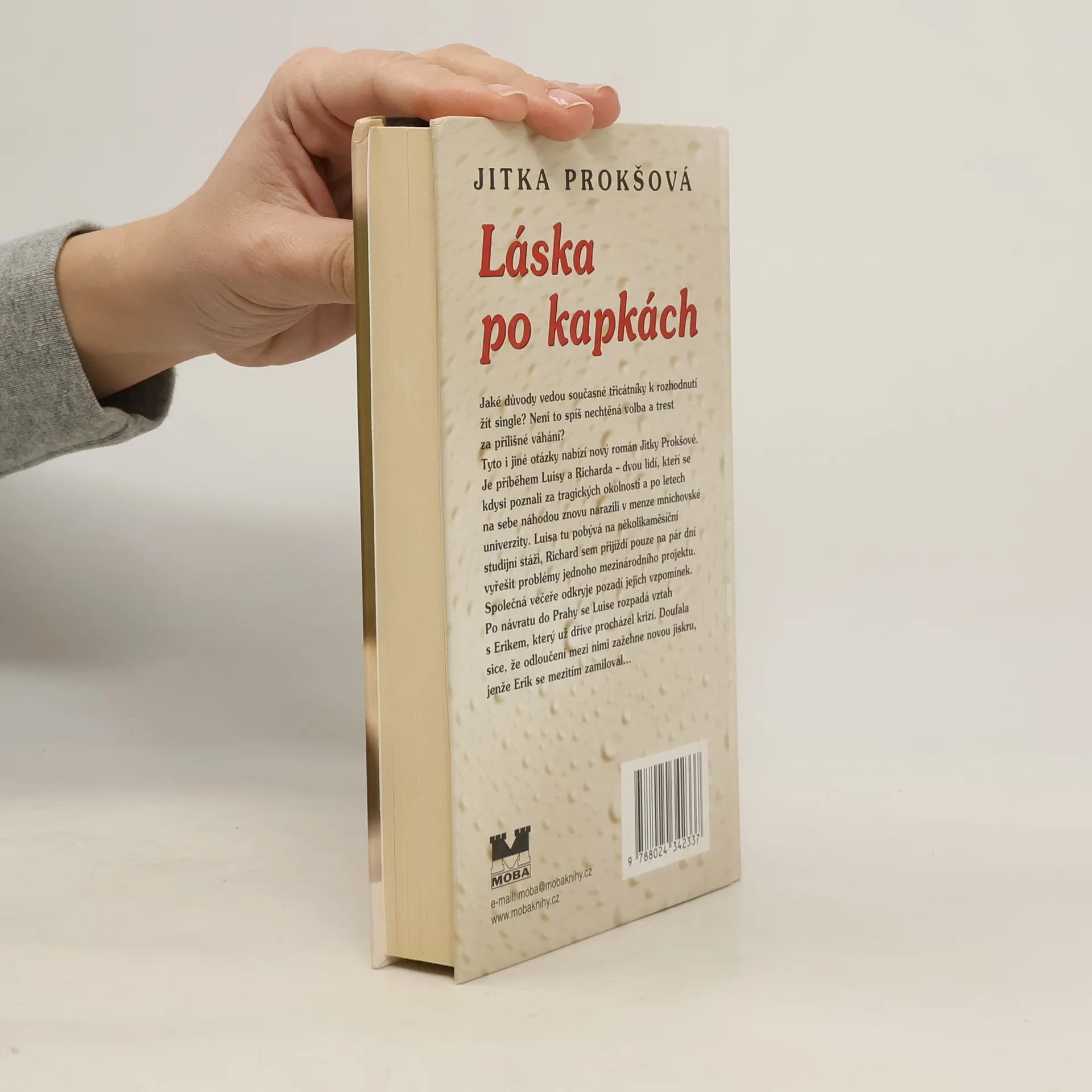 Jaké důvody vedou současné třicátníky k rozhodnutí žít jako single? Není to spíš nechtěná volba a trest za přílišné váhání? Tyto i jiné otázky nabízí čtenáři nová próza Jitky Prokšové Láska po kapkách. Je příběhem Luisy a Richarda - příběhem dvou osaměle žijících lidí, kteří se kdysi poznali za tragických okolností a po letech na sebe náhodou znovu narazili v menze mnichovské univerzity. Luisa tu pobývá na několikaměsíční studijní stáži, Richard sem přijíždí pouze na pár dní vyřešit problémy jednoho mezinárodního projektu. Společná večeře odkryje pozadí jejich vzpomínek. Po návratu do Prahy se Luise rozpadá vztah s Erikem, který už dříve procházel krizí. Doufala sice, že odloučení mezi nimi zažehne novou jiskru, jenže Erik se mezitím zamiloval. Objektem jeho touhy však není žena, ale muž... Luisa se svěří se svým milostným nezdarem Richardovi a vnímá, že jeho kamarádství přerůstá v lásku. Sama nepřestává doufat, že se k ní Erik vrátí. Jak jejich milostné tápání dopadne?