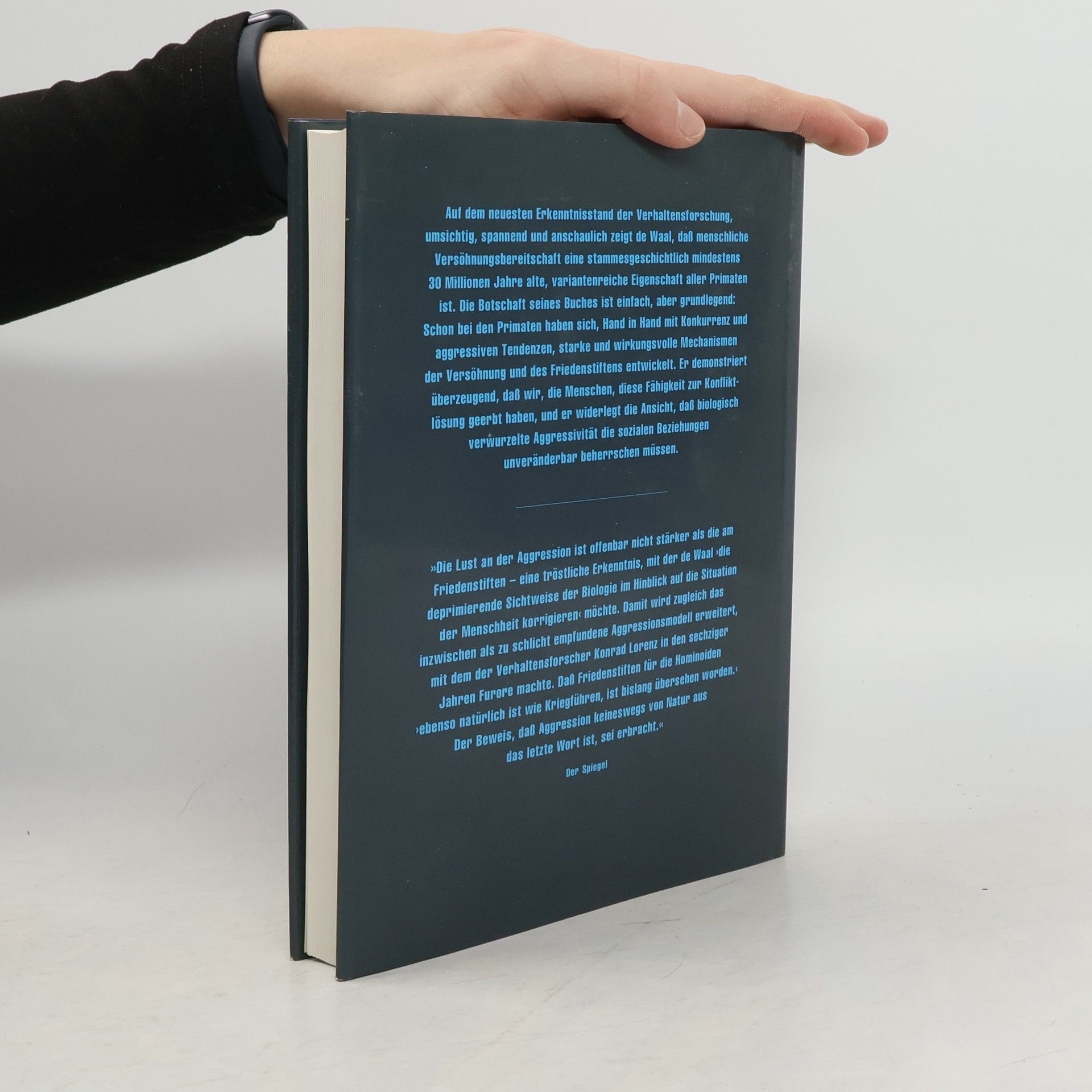 Die Botschaft von Frans de Waals Buch ist einfach, aber grundlegend: Schon bei den Primaten haben sich, Hand in Hand mit Konkurrenz und aggressiven Tendenzen, starke und wirkungsvolle Mechanismen der Versöhnung und des Friedensstiftens entwickelt. Er demonstriert überzeugend, daß wir, die Menschen, diese Fähigkeit zur Konfliktlösung geerbt haben, und er widerlegt die Ansicht, daß biologisch verwurzelte Aggressivität die sozialen Beziehungen unveränderbar beherrschen müssen. Wir dürfen uns nicht der Illusion hingeben, daß aggressive Neigungen uns jemals verlassen werden, doch sollten wir ebensowenig unser Erbe an Versöhnungsbereitschaft vernachlässigen. (Süddeutsche Zeitung). Zu dieser neuen Betrachtungsweise trägt das kenntnisreich und zugleich unterhaltsam geschriebene Buch ein gut Teil bei.