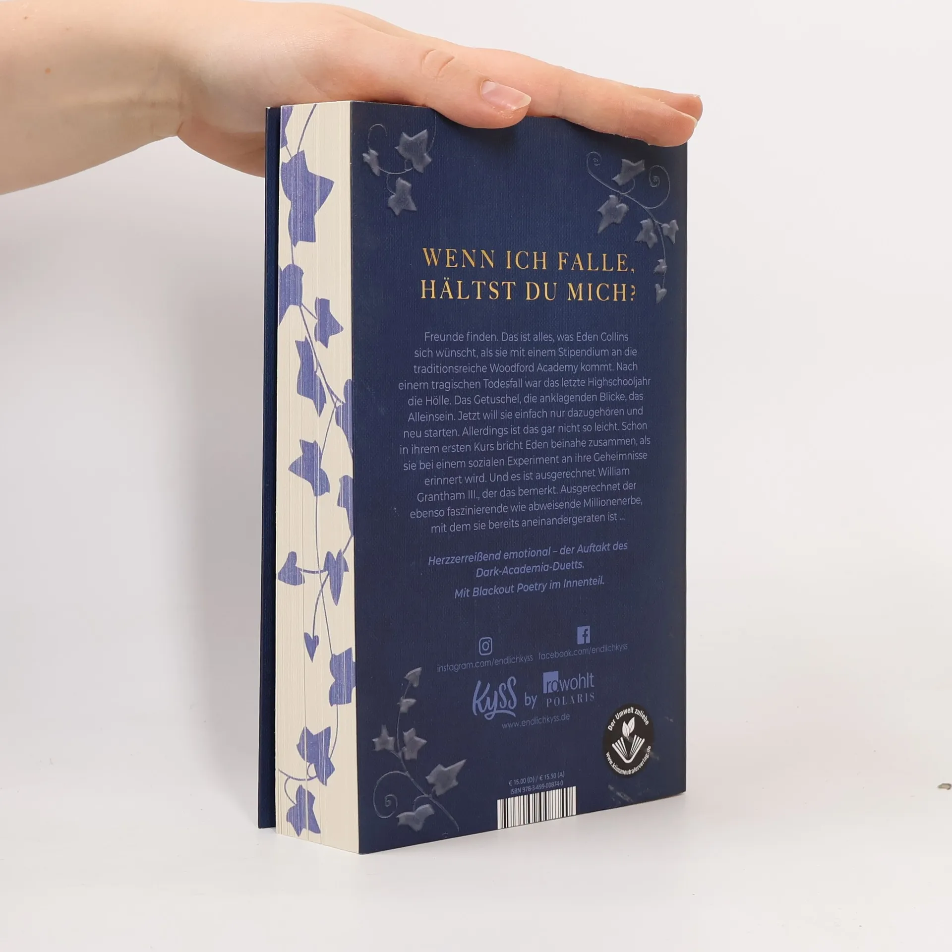 Wenn ich falle, hältst du mich? Der Auftakt zum Dark-Academia-Duett von Spiegel-Bestseller-Autorin Nikola Hotel. Freunde finden. Das ist alles, was Eden Collins sich wünscht, als sie mit einem Stipendium an die traditionsreiche Woodford Academy kommt. Nach einem tragischen Todesfall war das letzte Highschooljahr die Hölle. Das Getuschel, die anklagenden Blicke, das Alleinsein. Jetzt will sie einfach nur dazugehören und neu starten. Allerdings ist das gar nicht so leicht. Schon in ihrem ersten Kurs bricht Eden beinahe zusammen, als sie bei einem sozialen Experiment an ihre Geheimnisse erinnert wird. Und es ist ausgerechnet William Grantham III., der das bemerkt. Ausgerechnet der ebenso faszinierende wie abweisende Millionenerbe, mit dem sie bereits aneinandergeraten ist … Herzzerreißend emotional – für alle Fans von mitreißenden Liebesromanen und Dark Academia. Mit Blackout Poetry im Innenteil.