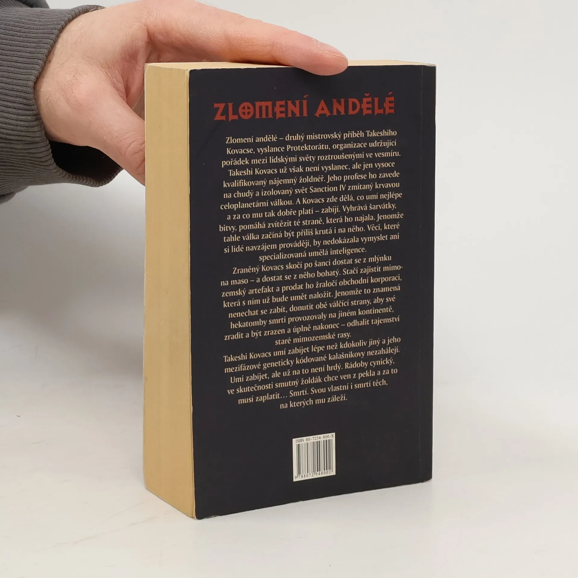 Zlomení andělé – druhý mistrovský příběh Takeshiho Kovacse, vyslance Protektorátu, organizace udržující pořádek mezi lidskými světy roztroušenými ve vesmíru. Takeshi Kovacs už však není vyslanec, ale jen vysoce kvalifikovaný nájemný žoldnéř. Jeho profese ho zavede na chudý a izolovaný svět Sanction IV zmítaný krvavou celoplanetární válkou. A Kovacs zde dělá, co umí nejlépe a za co mu tak dobře platí – zabíjí. Vyhrává šarvátky, bitvy, pomáhá zvítězit té straně, která ho najala. Jenomže tahle válka začíná být příliš krutá i na něho. Věci, které si lidé navzájem provádějí, by nedokázala vymyslet ani specializovaná umělá inteligence. Zraněný Kovacs skočí po šanci dostat se z mlýnku na maso – a dostat se z něho bohatý. Stačí zajistit mimozemský artefakt a prodat ho žraločí obchodní korporaci, která s ním už bude umět naložit. Jenomže to znamená nenechat se zabít, donutit obě válčící strany, aby své hekatomby smrti provozovaly na jiném kontinentě, zradit a být zrazen a úplně nakonec – odhalit tajemství staré mimozemské rasy. Takeshi Kovacs umí zabíjet lépe než kdokoliv jiný a jeho mezifázové geneticky kódované kalašnikovy nezahálejí. Umí zabíjet, ale už na to není hrdý. Rádoby cynický, ve skutečnosti smutný žoldák chce ven z pekla a za to musí zaplatit… Smrtí. Svou vlastní i smrtí těch, na kterých mu záleží.