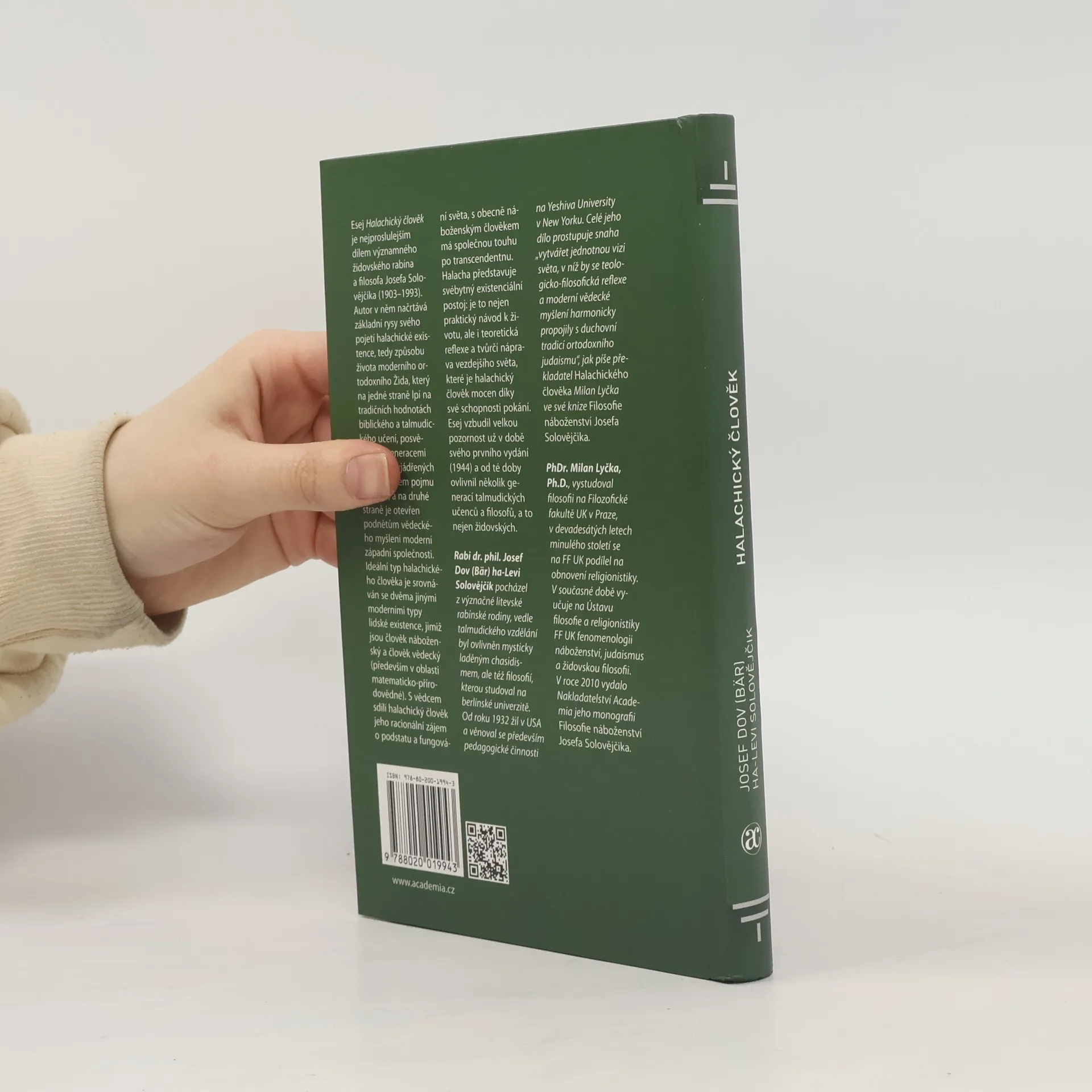 Esej Halachický člověk je nejproslulejším dílem významného židovského rabína a filosofa Josefa Solovějčika (1903-1993). Autor v něm načrtává základní rysy svého pojetí halachické existence, tedy způsobu života moderního ortodoxního Žida, který na jedné straně lpí na tradičních hodnotách biblického a talmudického učení, posvěcených generacemi předků a vyjádřených v teologickém pojmu halacIš ha-halacha-galuj ve-nistara, a na druhé straně je otevřen podnětům vědeckého myšlení moderní západní společnosti. Ideální typ halachického člověka je srovnáván se dvěma jinými moderními typy lidské existence, kterými jsou člověk náboženský a člověk vědecký (matematický přírodovědec). S vědcem halachický člověk sdílí jeho racionální zájem o podstatu a fungování světa, s obecně náboženským člověkem má společnou touhu po transcendentnu. Halacha představuje svébytný existenciální postoj: je to nejen praktický návod k životu, ale i teoretická reflexe a tvůrčí náprava vezdejšího světa, které je halachický člověk mocen díky své schopnosti pokání. Esej vzbudil velkou pozornost už v době svého prvního vydání (1944) a od té doby ovlivnil několik generací talmudických učenců a filosofů, a to nejen židovských. Vychází v edici Judaica.