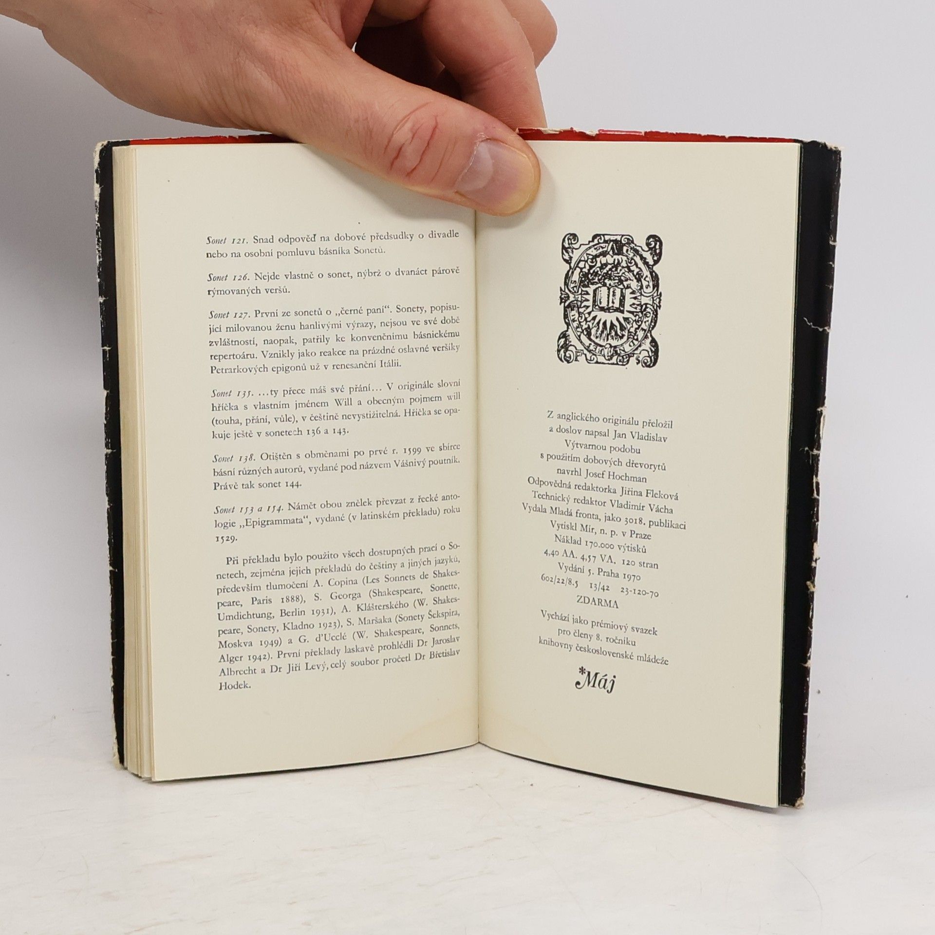 Páté vydání 154 Shakespearových sonetů, tentokrát v překladu Jana Vladislava. Prémiový svazek 8. ročníku edice Máj.