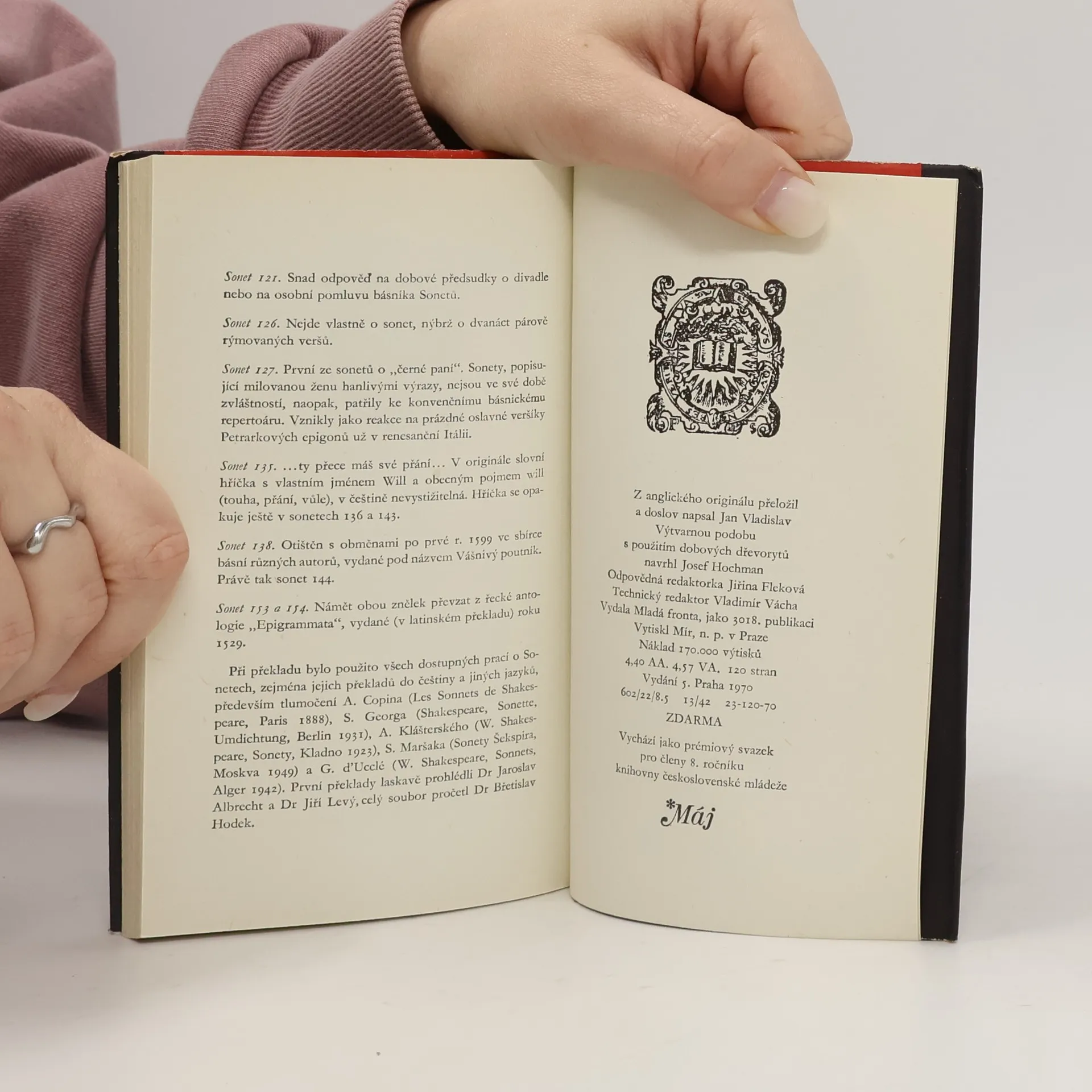 Páté vydání 154 Shakespearových sonetů, tentokrát v překladu Jana Vladislava. Prémiový svazek 8. ročníku edice Máj.