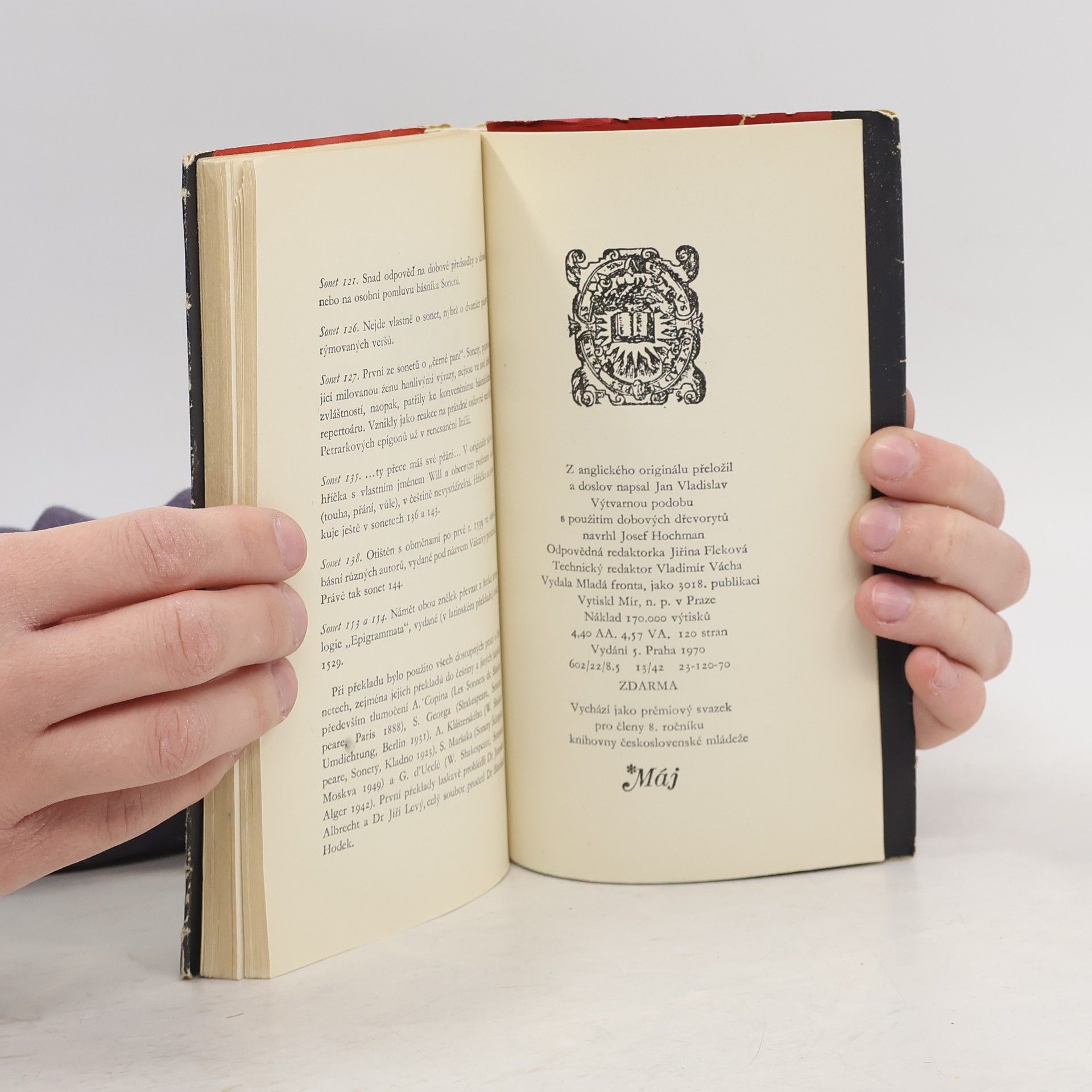 Páté vydání 154 Shakespearových sonetů, tentokrát v překladu Jana Vladislava. Prémiový svazek 8. ročníku edice Máj.