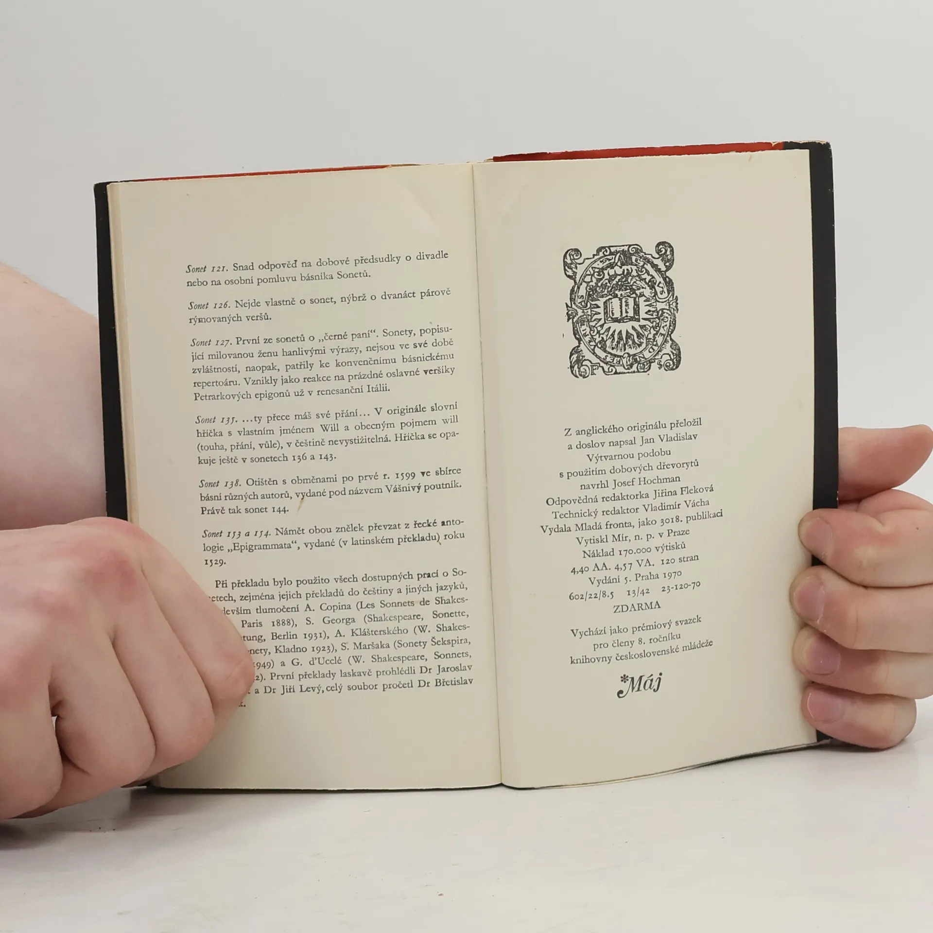 Páté vydání 154 Shakespearových sonetů, tentokrát v překladu Jana Vladislava. Prémiový svazek 8. ročníku edice Máj.