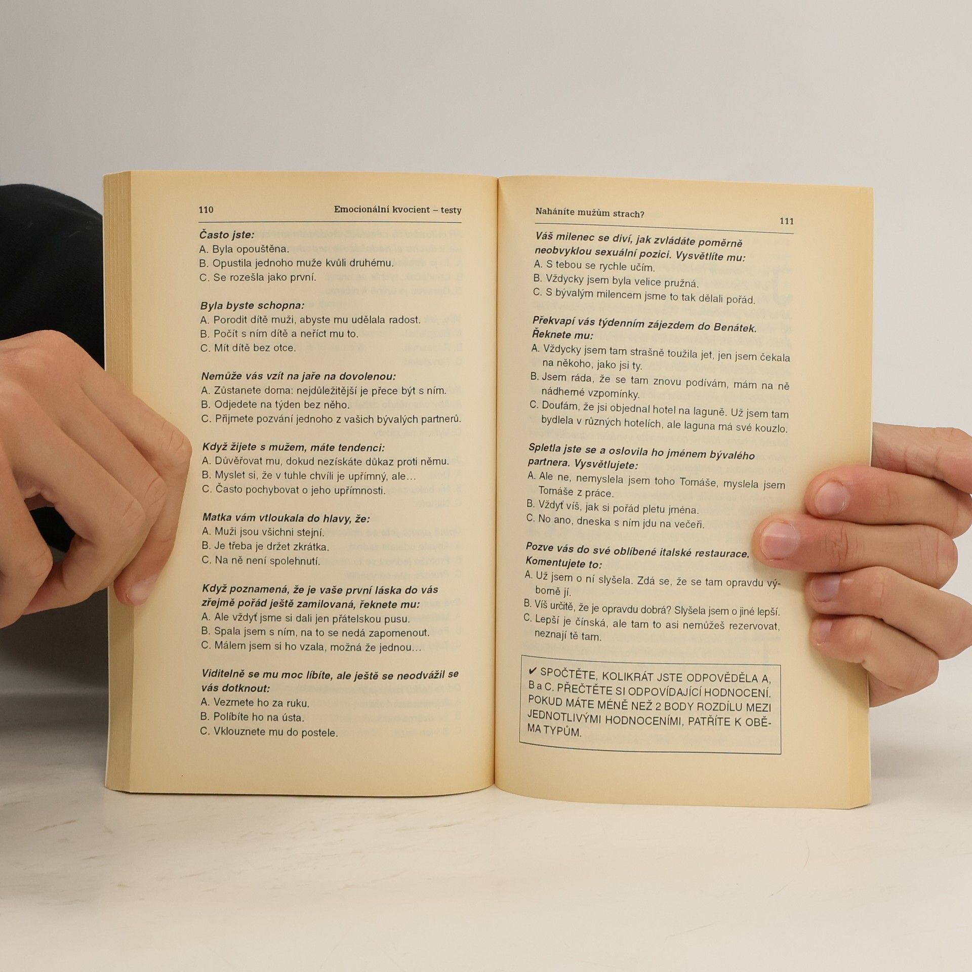 21 testů se snaží odhalit emocionální psychostyl osobnosti a zhodnotit vztahy k lidem. Příručka se zabývá emocionální inteligencí osobnosti, pomáhá člověku odhalit mnoho různých vlastností, jako je vlastní sebevědomí, schopnost vyznat se ve vlastních citech, kontrolovat své reakce a komunikovat s ostatními lidmi. Emocionální inteligence je posuzována v rámci schopností sebepoznání a vytváření vztahů k ostatním lidem. Kniha je však zaměřena především na vztahy mezi mužem a ženou a vztahy milostné.