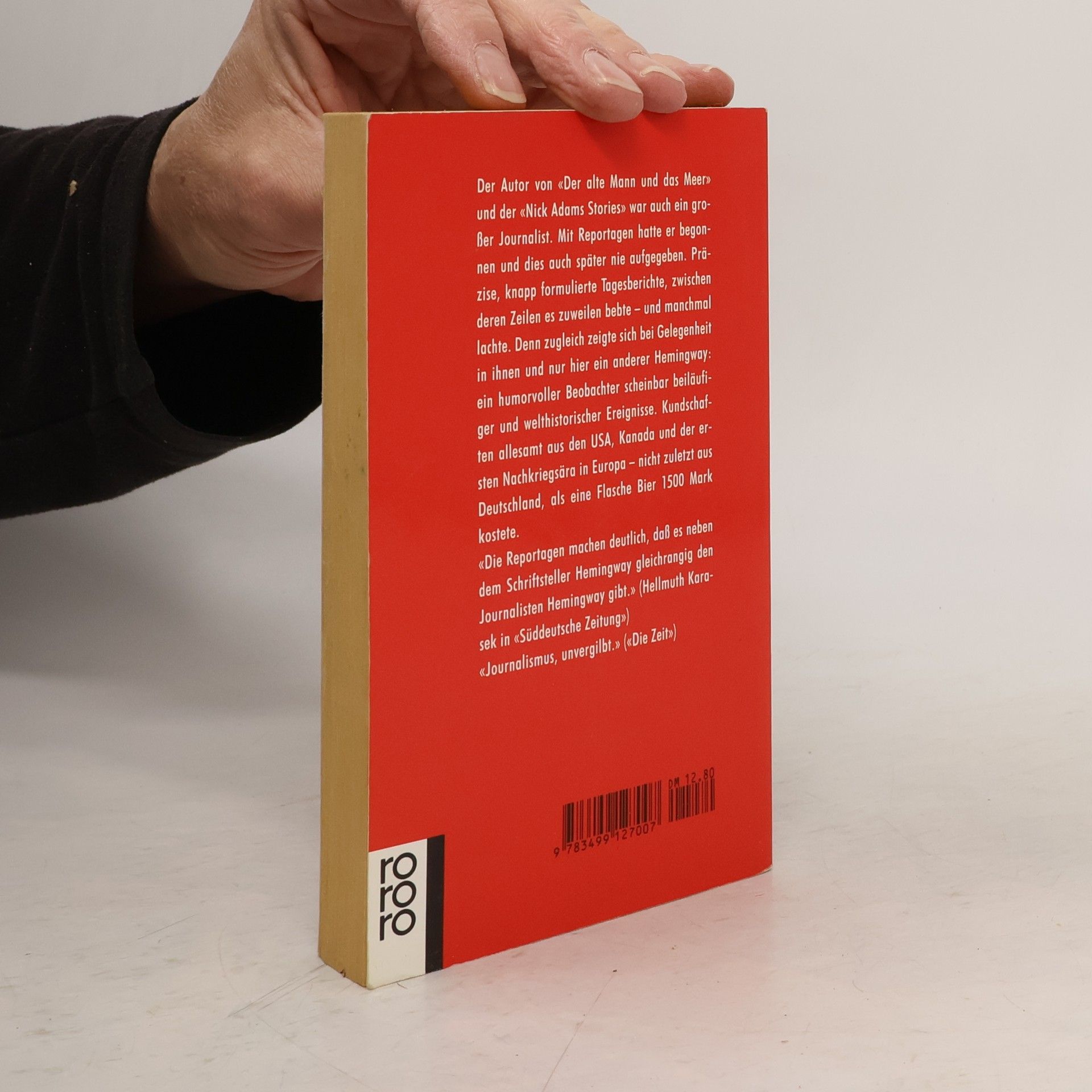 Der Autor von „Der alte Mann und das Meer“ und der „Nick Adams Stories“ war auch ein großer Journalist. Mit Reportagen hatte er begonnen und dies auch später nie aufgegeben. Präzise, knapp formulierte Tagesberichte, zwischen deren Zeilen es zuweilen bebte - und manchmal lachte. Denn zugleich zeigte sich bei Gelegenheit in ihnen und nur hier ein anderer Hemingway: ein humorvoller Beobachter scheinbar beiläufiger und welthistorischer Ereignisse. Kundschaften allesamt aus den USA, Kanada und der ersten Nachkriegsära in Europa - nicht zuletzt aus Deutschland, als eine Flasche Bier 1500 Mark kostete.