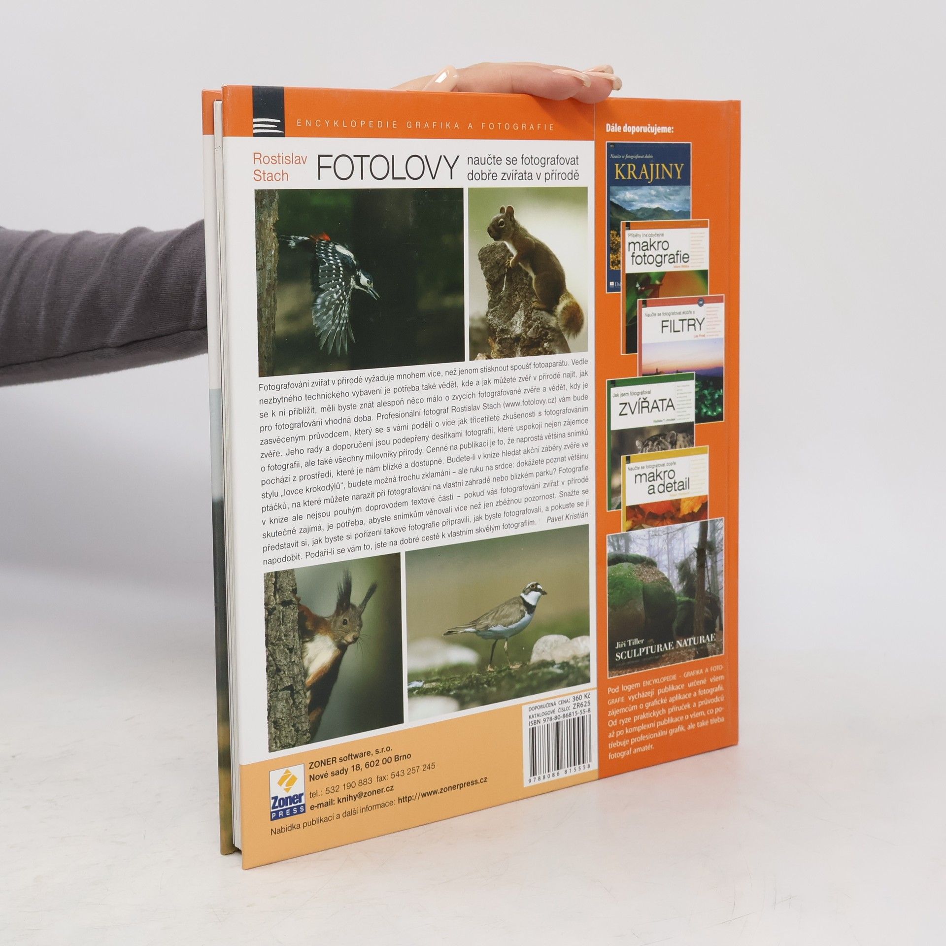 Fotografování zvířat v přírodě vyžaduje mnohem více, než jenom stisknout spoušť fotoaparátu. Vedle nezbytného technického vybavení je potřeba také vědět, kde a jak můžete zvěř v přírodě najít, jak se k ní přiblížit, měli byste znát alespoň něco málo o zvycích fotografované zvěře a vědět, kdy je pro fotografování vhodná doba.Profesionální fotograf Rostislav Stach vám bude zasvěceným průvodcem, který se s vámi podělí o více jak třicetileté zkušenosti s fotografováním zvěře. Jeho rady a doporučení jsou podepřeny desítkami fotografií, které uspokojí nejen zájemce o fotografii, ale také všechny milovníky přírody. Cenné na publikaci je to, že naprostá většina snímků pochází z prostředí, které je nám blízké a dostupné.Budete-li v knize hledat akční záběry zvěře ve stylu „lovce krokodýlů“, budete možná trochu zklamáni – ale ruku na srdce: dokážete poznat většinu ptáčků, na které můžete narazit při fotografování na vlastní zahradě nebo v blízkém parku? Fotografie v knize ale nejsou pouhým doprovodem textové části – pokud vás fotografování zvířat v přírodě skutečně zajímá, je potřeba, abyste snímkům věnovali více než jen zběžnou pozornost. Snažte se představit si, jak byste si pořízení takové fotografie připravili, jak byste fotografovali, a pokuste se ji napodobit. Podaří-li se vám to, jste na dobré cestě k vlastním skvělým fotografiím.