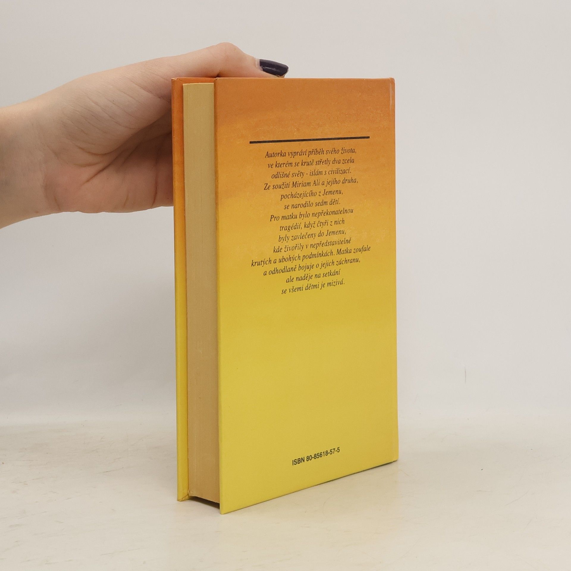 Autorka vypráví příběh svého života, ve kterém se krutě střetly dva zcela odlišné světy – islám s civilizací. Z jejího soužití s druhem, pocházejícím z Jemenu, se narodilo sedm dětí. Pro ni jako matku bylo nepředstavitelnou tragédií, když čtyři z nich byly zavlečeny do Jemenu, kde živořily v nepředstavitelně krutých a ubohých podmínkách. Matka zoufale a odhodlaně bojuje o jejich záchranu, ale naděje na setkání se všemi dětmi je mizivá.... celý text