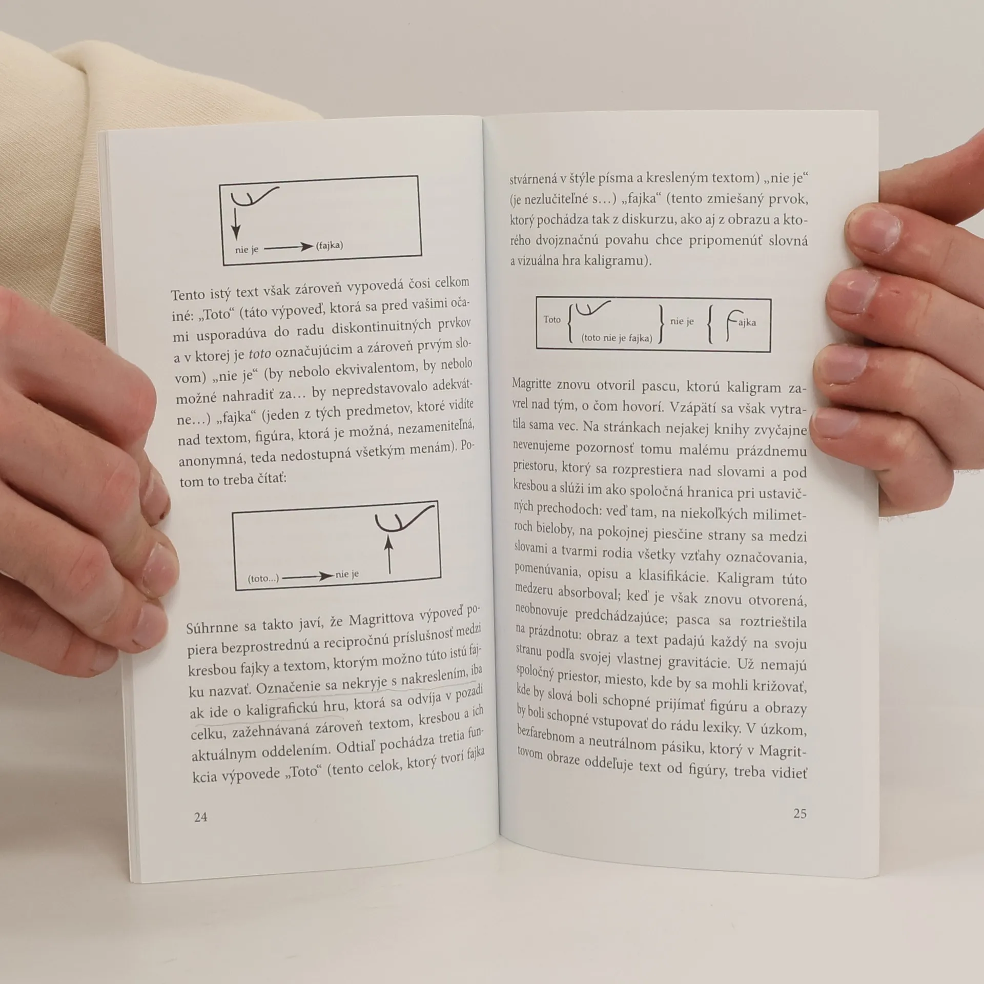 V Magrittovom obraze, kde je fajka a pod ňou nápis Toto nie je fajka, našiel autor knižky spochybnenie princípu napodobňovania, ktorý dlho vládol v západnom maliarstve a nielen tam. V Magrittovom maliarstve sa podľa Foucaulta dostáva do obehu obraz bez vonkajšieho vzoru, bez imitácie niečoho daného. Takýto obraz Platón nazval simulakrom a jeho tvorcov odsúdil ako výrobcov preludov. A práve pojem simulakra nám umožňuje chápať mnohé fenomény súčasnej vizuálnej kultúry. Kaligram je teda tautológia. Ale nie taká ako v rétorike. Rétorika ťaží z nadbytku reči; využíva možnosť dvakrát povedať to isté rozličnými slovami; profituje z nadmerného bohatstva, ktoré nám dovoľuje jedným a tým istým slovom povedať dve rozličné veci; podstatou rétoriky je alegória. Kaligram využíva tú vlastnosť písmen, že majú význam ako lineárne prvky, ktoré možno rozložiť v priestore, a zároveň ako znaky, ktoré treba rozvíjať v jednotnej reťazi zvukovej substancie. Znak, písmeno dovoľuje určiť slovo; čiara zasa dovoľuje stvárniť vec. Kaligram mieni teda hravo zotrieť najstaršie protiklady našej alfabetizovanej civilizácie: ukázať a pomenovať; stvárniť a povedať; reprodukovať a artikulovať; napodobniť a označiť; pozorovať a čítať.