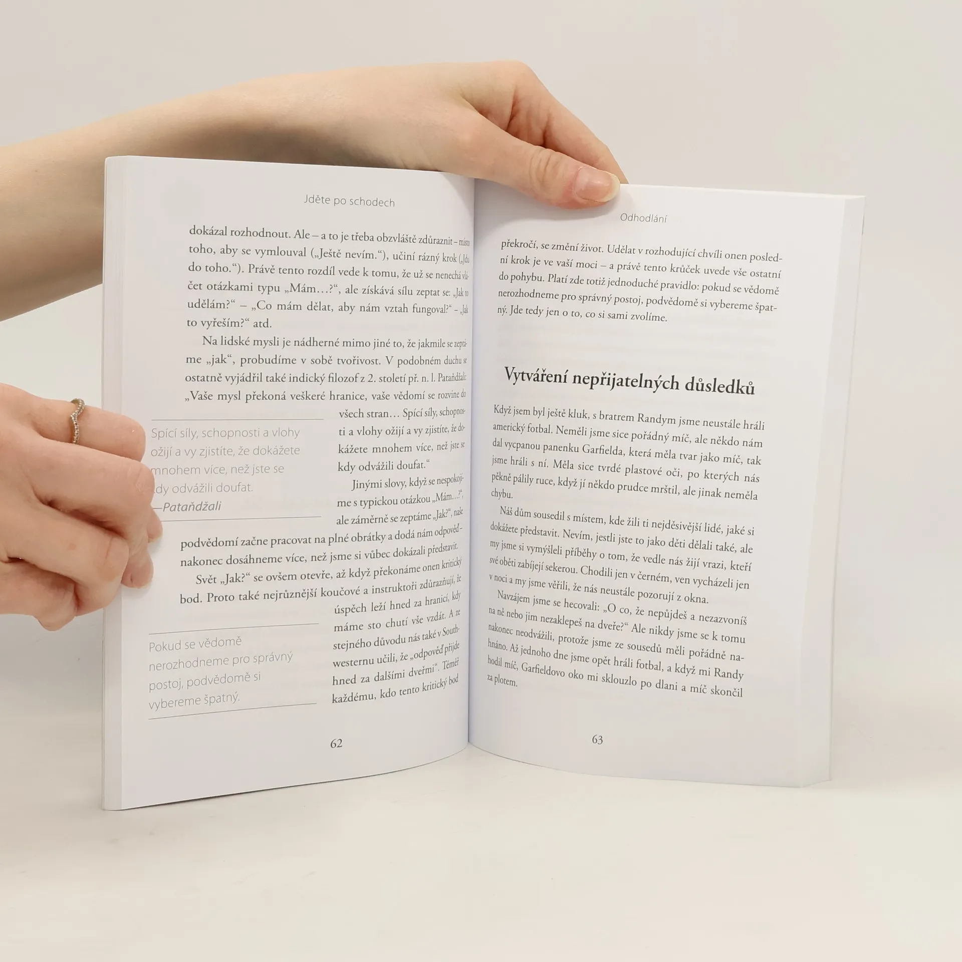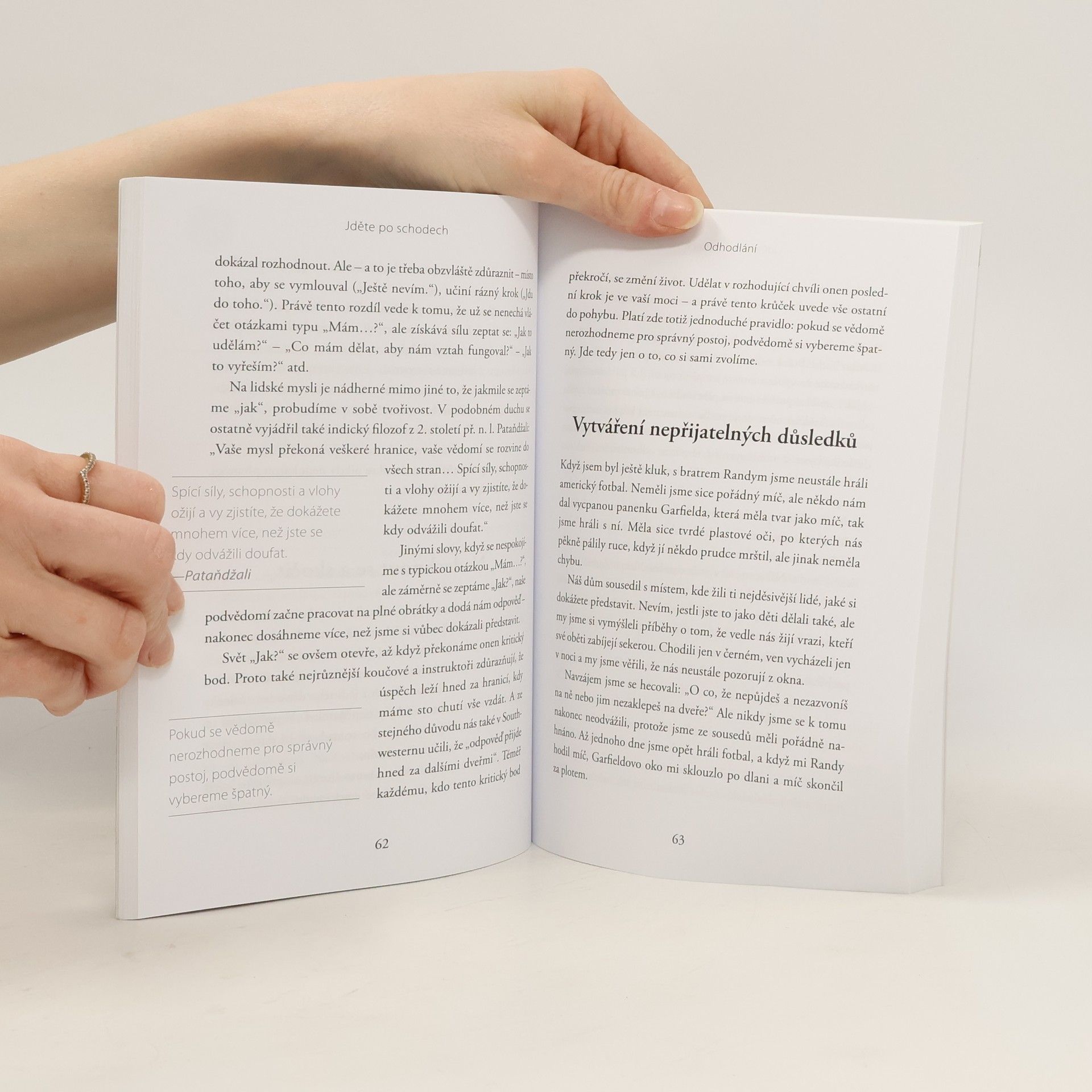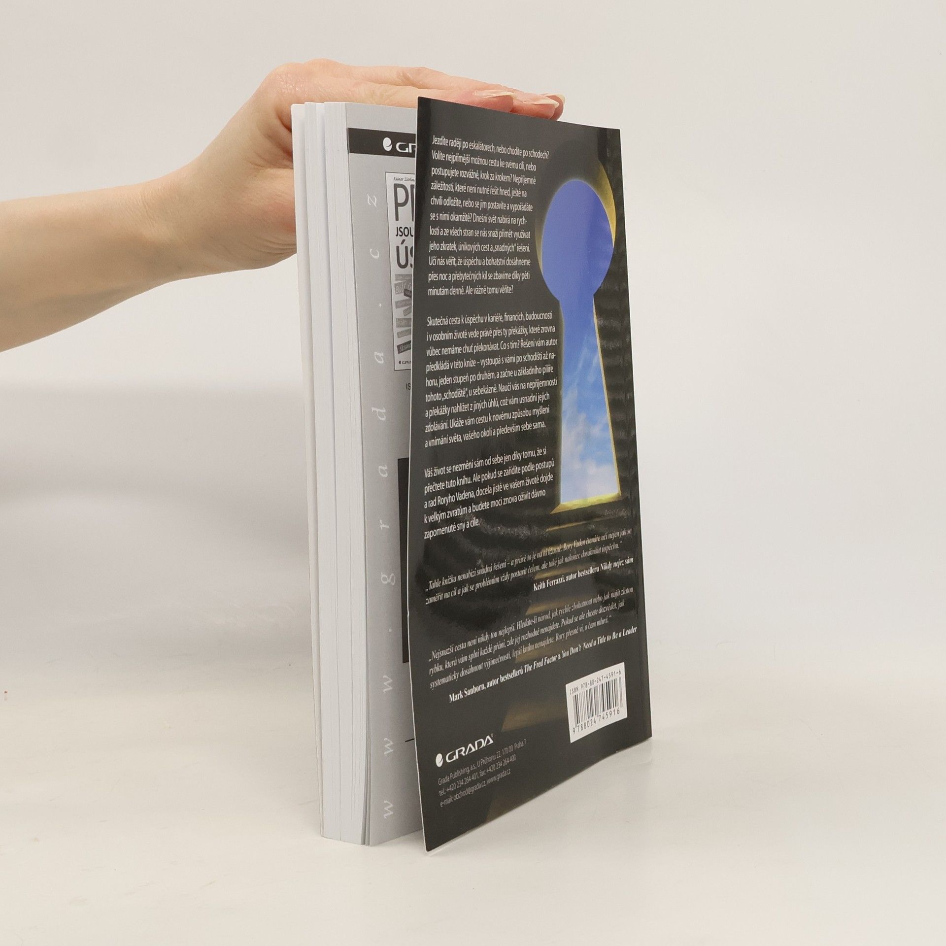 Jezdíte raději po eskalátorech, nebo chodíte po schodech? Volíte nejpřímější možnou cestu ke svému cíli, nebo postupujete rozvážně, krok za krokem? Nepříjemné záležitosti, které není nutné řešit hned, ještě na chvíli odložíte, nebo se jim postavíte a vypořádáte se s nimi okamžitě? Dnešní svět nabírá na rychlosti a ze všech stran se nás snaží přimět využívat jeho zkratek, únikových cest a "snadných" řešení. Učí nás věřit, že úspěchu a bohatství dosáhneme přes noc a přebytečných kil se zbavíme díky pěti minutám denně. Ale vážně tomu věříte? Skutečná cesta k úspěchu v kariéře, financích, budoucnosti i v osobním životě, vede právě přes ty překážky, které zrovna vůbec nemáme chuť překonávat. Co s tím? Řešení vám autor předkládá v této knize - vystoupá s vámi po schodišti až nahoru, jeden stupeň po druhém, a začne u základního pilíře tohoto "schodiště", u sebekázně. Naučí vás na nepříjemnosti a překážky nahlížet z jiných úhlů, což vám usnadní jejich zdolávání. Ukáže vám cestu k novému způsobu myšlení a vnímání světa, vašeho okolí a především sebe sama. Váš život se nezmění sám od sebe jen díky tomu, že si přečtete tuto knihu. Ale pokud se zařídíte podle postupů a rad Roryho Vadena, docela jistě ve vašem životě dojde k velkým zvratům a budete moci znova oživit dávno zapomenuté sny a cíle.