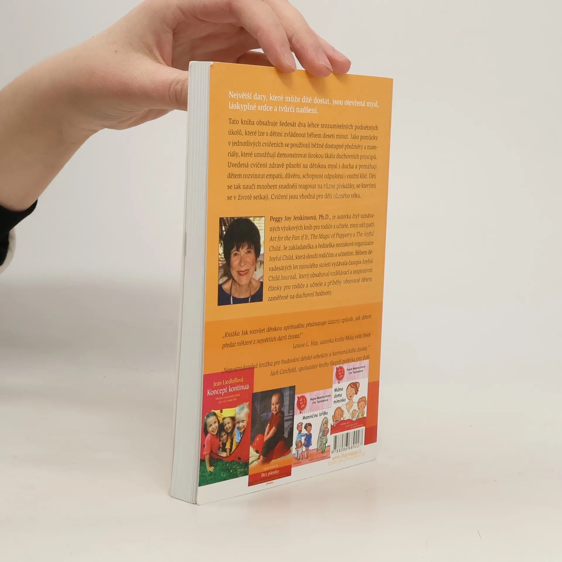 Největší dary, které může dítě dostat, jsou otevřená mysl, láskyplné srdce a tvůrčí nadšení. V knížce nalezneme 62 jednoduchých a lehce srozumitelných úkolů, které naše děti podnítí k zamyšlení, umožní jim setkat se s mnoha různými duchovními principy a pomohou jim rozvinout empatii, důvěru, odpuštění a vnitřní klid. V úkolech, které jsou určené pro děti různého věku, se používají běžně dostupné materiály. Autorka se zabývá vzděláváním dospělých, zaměřuje se na práci s rodiči a učiteli, pomáhá jim porozumět různému chování dětí a aktivovat jejich vnitřní radost.