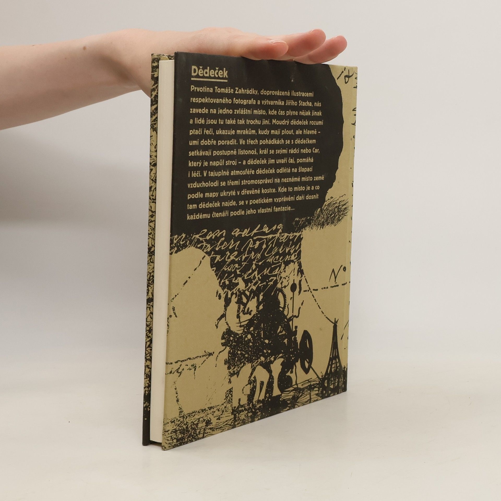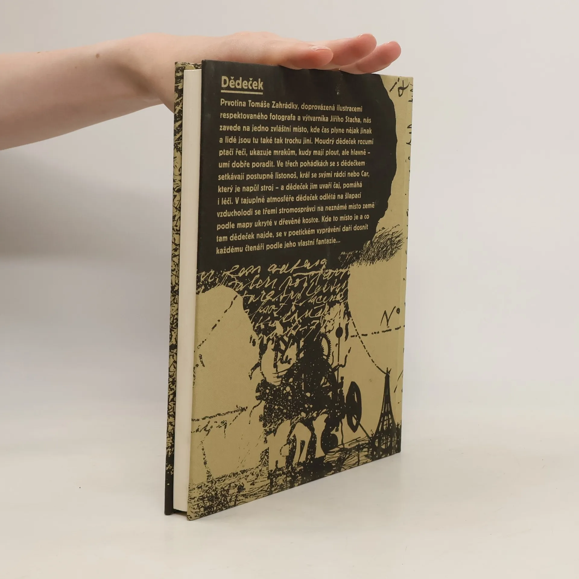 Prvotina Tomáše Zahrádky – doprovázená ilustracemi respektovaného fotografa a výtvarníka Jiřího Stacha – nás zavede na blíže neurčené místo, kde čas plyne pomalu a lidé jsou zde tak trochu zvláštní. Hlavním hrdinou knihy je dobrotivý a moudrý dědeček, který rozumí ptačí řeči, pěkně vypráví a sází stromy na sněhu. Dědečkův svět je plný nadpřirozených prvků, jež spolu s poetickým vyprávěním vytváří laskavou a tajuplnou atmosféru příběhu. V několika povídkách se s dědečkem setkávají různé postavy – listonoš, král, car, jenž je tak trochu strojem, či muž, který jezdí na pavoucích – a dědeček jim vaří čaj, pomáhá i léčí. V otevřeném závěru pohádky dědeček odlétá na šlapací vzducholodi se třemi stromosprávci na neznámé místo země, které na mapě svítí. Kde to místo je a co tam dědeček najde, zůstává již na čtenáři...