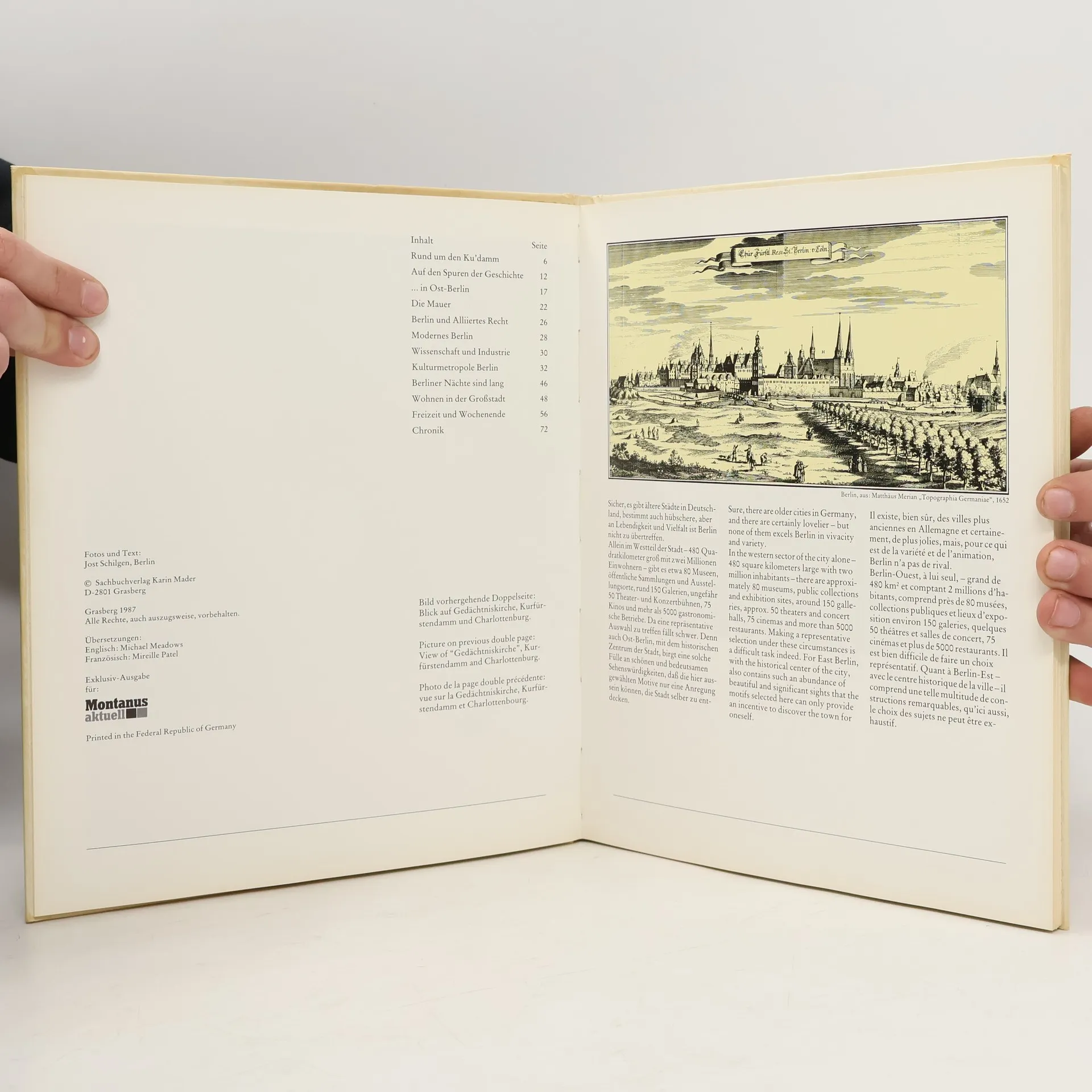 Berlin ist mit seinen zahlreichen Kunstschätzen, Museen, Theatern und Konzerthäusern, einer vielfältigen Kuhurszene, den internationalen Messen und Festspielen und vielen bedeutenden Einrichtungen von Wissenschaft, Forschung und Industrie schon „immer eine Reise wert“ gewesen. Die Öffnung der Mauer im November 1989 und die Vereinigung Deutschlands machten Berlin noch attraktiver: Ohne Grenzformalitäten erschließt sich Besuchern und Einheimischen die ganze Stadt. Dem interessierten Beobachter werden nirgendwo sonst die Entwicklungsspuren der jüngsten deutschen Geschichte und das Zusammenwachsen der beiden Teile Deutschlands deutlicher vor Augen geführt als zwischen Köpenick und Reinickendorf, Spandau und Marzahn. Und das schöne Umland, die Havellandschaft, Potsdam und der Spreewald sind schnell erreicht. Von den zahllosen Sehenswürdigkeiten der Stadt will dieses Buch die schönsten und interessantesten zeigen und den Betrachter einladen, Berlin selbst zu entdecken.