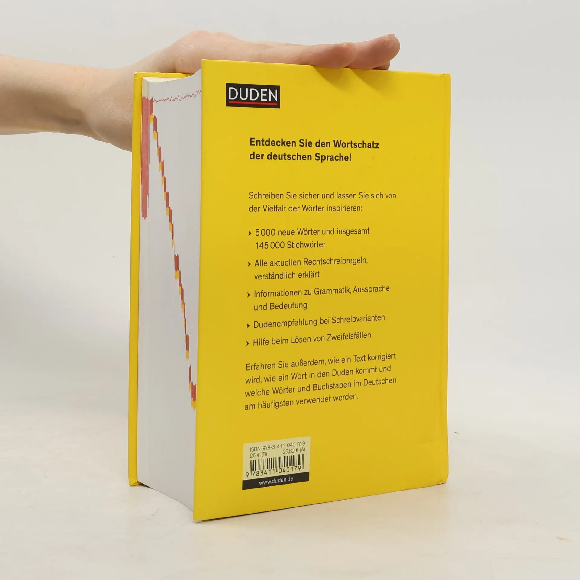 Rund 145.000 Stichwörter, davon rund 5000 neu - Informationen zu Grammatik, Aussprache, Bedeutung - Empfehlungen bei Schreibvarianten - Hilfe beim Lösen von Zweifelsfällen - nach dem Stand der Rechtschreibregelungen vom Juni 2017 Und auf 140 Seiten erklären wir Rechtschreib- und Zeichensetzungsregeln, wie ein Wort in den Duden kommt, welche Wörter am häufigsten verwendet werden, wie ein Text korrigiert wird und vieles mehr