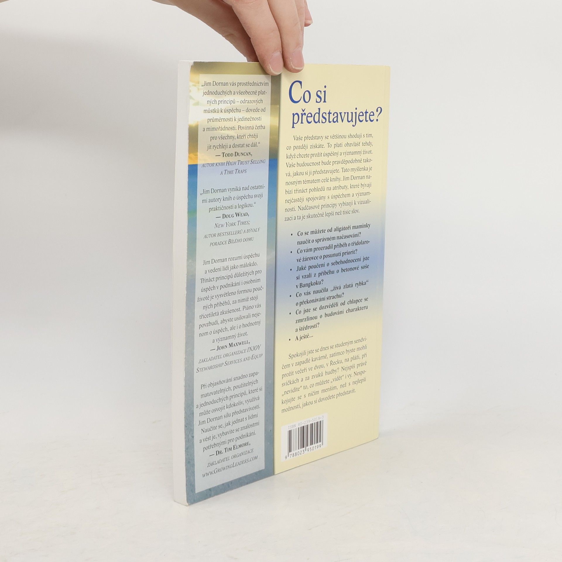 Představy, principy a perspektivy úspěšného vedení jiných i sebe Co si představujete? Vaše představy se většinou shodují s tím, co později získáte. To platí obzvlášť tehdy, když chcete prožít úspěšný a významný život. Vaše budoucnost bude pravděpodobně taková, jakou si ji představujete. Tato myšlenka je nosným tématem celé knihy. Jim Dornan nabízí třináct pohledů na atributy, které bývají nejčastěji spojovány s úspěchem a významností. Nadčasové principy vybízejí k vizualizaci a ta je skutečně lepší než tisíc slov. Příklady • Co se můžete od aligátoří maminky naučit o správném načasováni? • Co vám prozradí příběh o třídolarové žárovce o překonávání strachu? a další