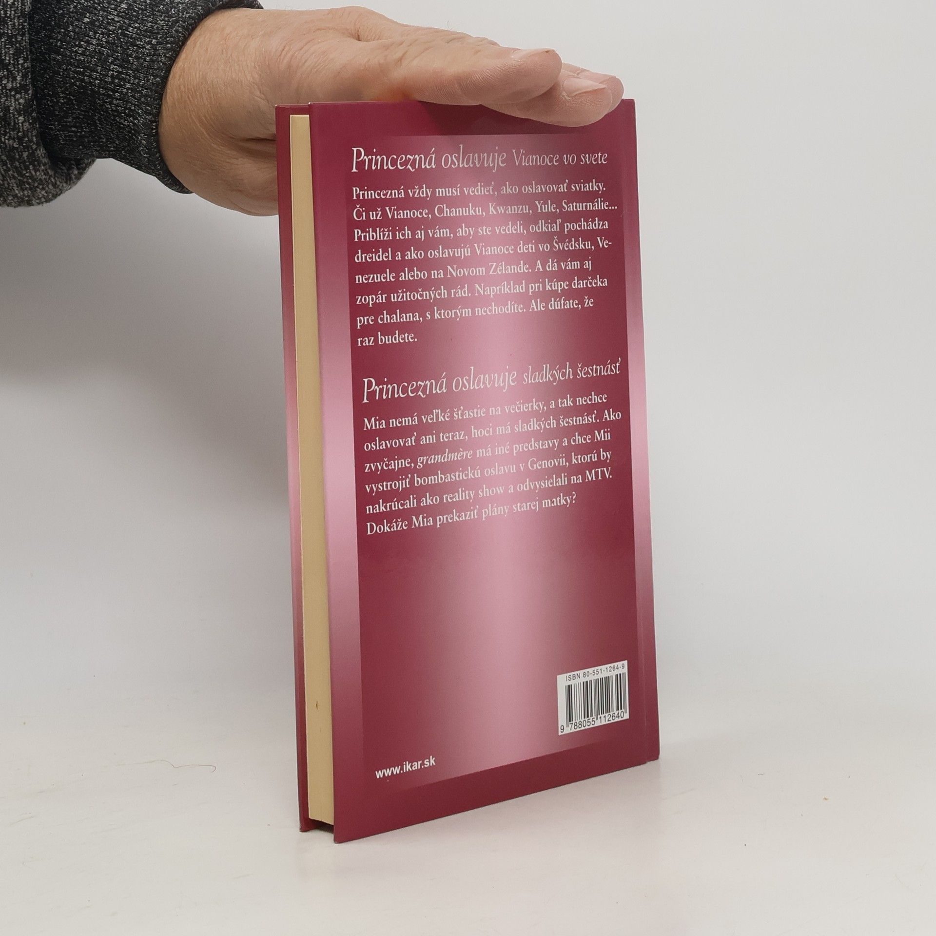 Princezná oslavuje Vianoce vo svete. Princezná vždy musí vedieť oslavovať sviatky. Či už Vianoce, Chanuku, Kwanzu, Yule, Saturnálie... Priblíži ich aj vám, aby ste vedeli, odkiaľ pochádza dreidel a ako oslavujú Vianoce deti vo Švédsku, Venezuele alebo na Novom Zélande. A dá vám aj zopár užitočných rád (napríklad pri kúpe darčeka pre chalana, s ktorým nechodíte. Ale dúfate, že raz budete). Princezná oslavuje sladkých šestnásť. Mia nemá veľké šťastie na večierky, a tak nechce nijakú oslavu, hoci má sladkých šestnásť. Ako zvyčajne, grandmere má iné predstavy a chce Mii vystrojiť bombastickú oslavu v Genovii, ktorú by nakrúcali ako reality show a odvysielali na MTV. Dokáže Mia prekaziť plány starej matky?
