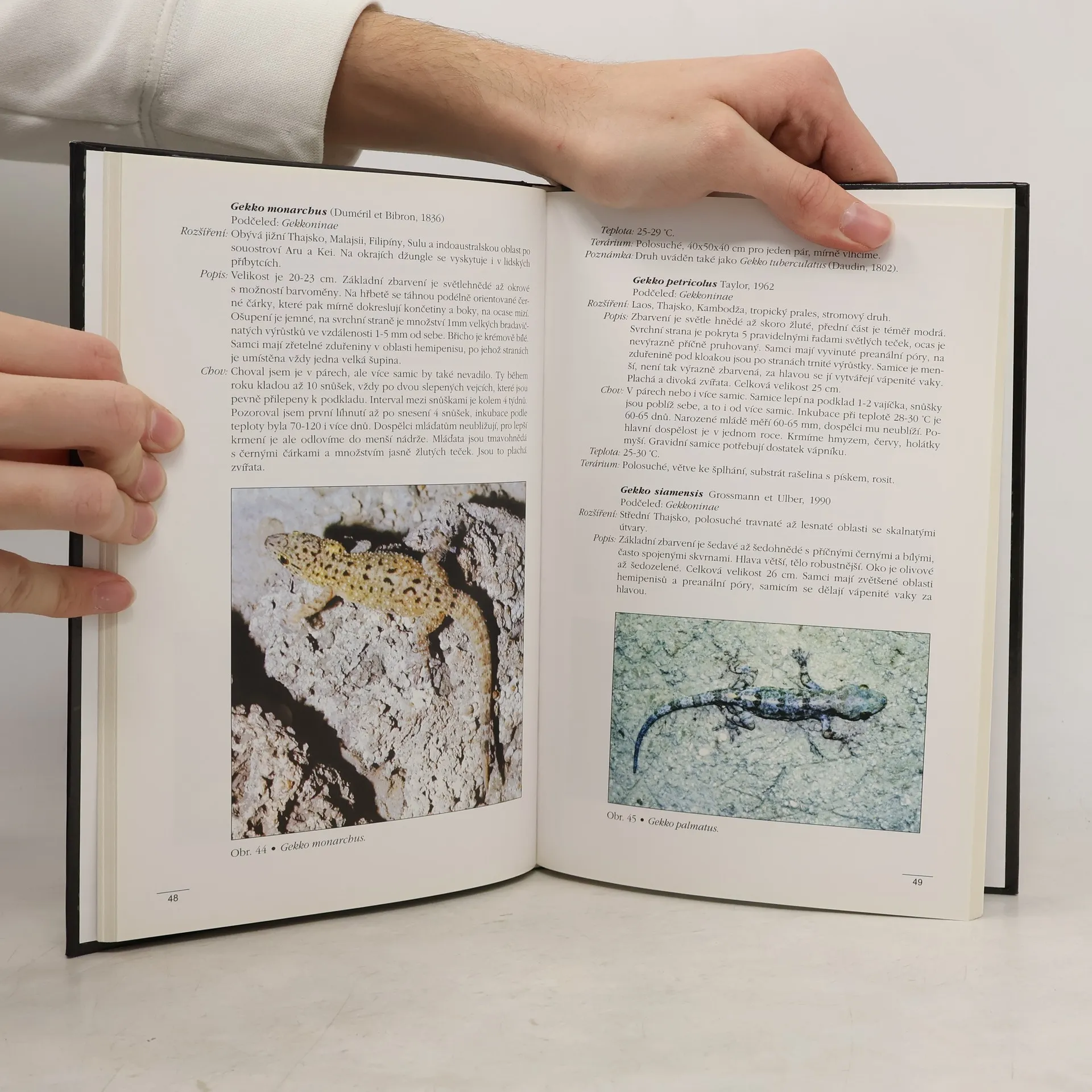 Obecná část knihy se věnuje systematice a charakteristice gekonů (rozčlenění do řádů, podřádů, čeledí, rodů, atd.; přesný popis vnější i vnitřní tělesné stavby, seznam chráněných druhů...), určování pohlaví, rozmnožování a šlechtění. Najdete zde i praktické informace ohledně chovu, jako je zařízení terária a jeho příslušenství, správné krmení, nemoci a parazité a obrana před nimi. Nechybí rozličné zajímavosti a specifika – nejmenší i největší, nejbarevnější a nejkrásnější druhy, druhy snadno i obtížněji chovatelné. V atlasové části najdete u každého jednotlivého druhu barevný portrét, latinský i český název, podčeleď, údaje o rozšíření ve volné přírodě, vzhledovou charakteristiku a podrobnou charakteristiku chovných nároků - potřebná teplota, vlhkost i vybavení terária. Navíc konkrétní zvláštnosti a užitečné poznámky a tipy ohledně krmení a další péče. Ze závěrečných stránek publikace se dozvíte, kde žijí gekoni nejblíže České republiky a jak je lze v přírodě lovit, včetně zajímavých loveckých historech a zážitků autora. Snadnou orientaci v atlasu zaručuje praktický přehledný rejstřík.