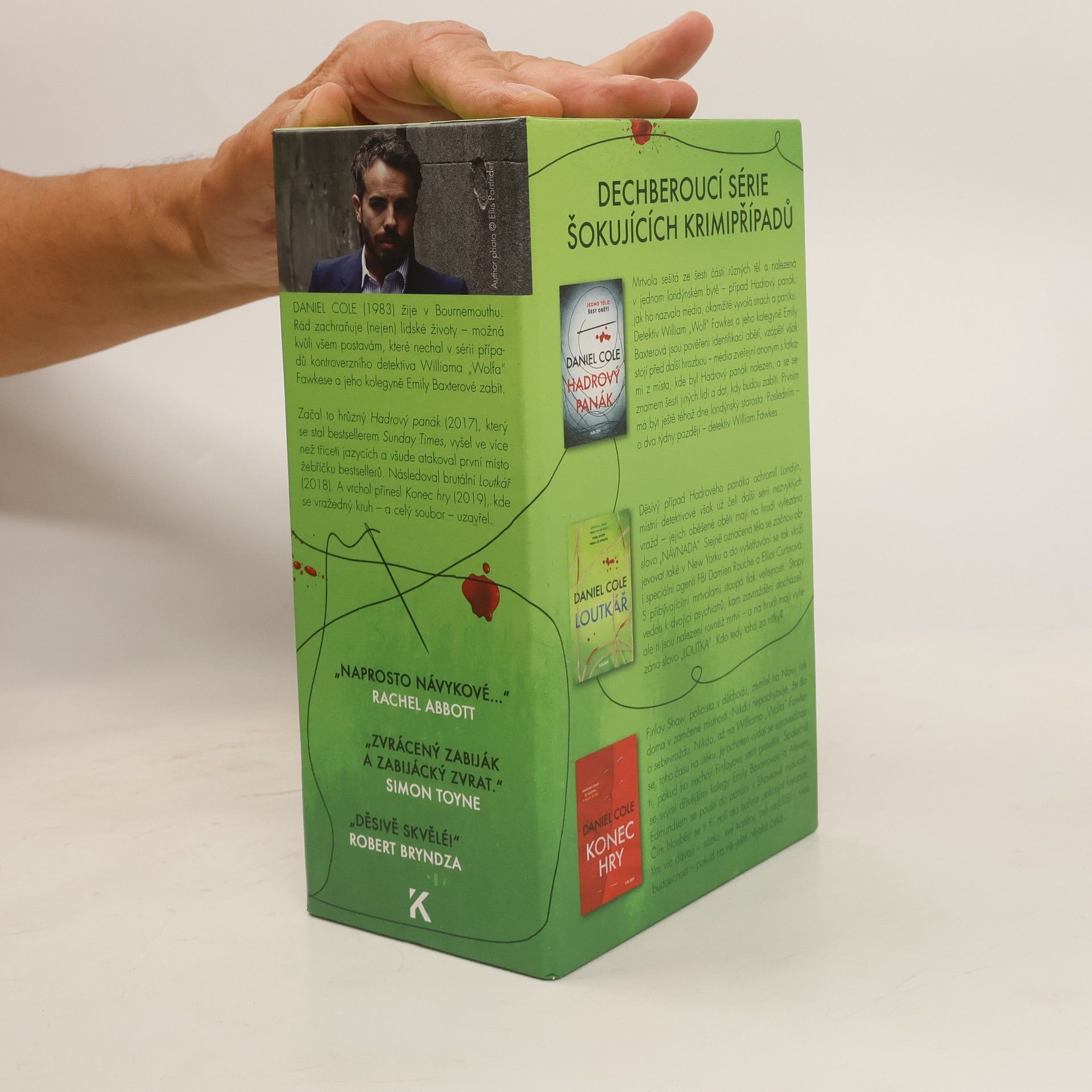 Jedno tělo, šest obětí. Vrah, který nemá co ztratit. V sázce je vše... Trilogie krimithrillerů, které šokovaly, vyděsily a napnuly čtenáře po celém světě, nyní speciálně v dárkovém boxu. Začalo to hrůzným Hadrovým panákem (2017), případem mrtvoly sešité z částí různých těl a nalezené v jednom londýnském bytě. Debut Daniela Colea vyšel ve více než třiceti jazycích a ve všech zemích atakoval nejvyšší příčky žebříčku bestsellerů. Pokračovalo to neméně úspěšným a brutálním Loutkářem (2018) o sérii nezvyklých vražd, jejichž oběti mají na hrudi vyřezané slovo „NÁVNADA“ a domnělí pachatelé slovo „LOUTKA“. A vyvrcholilo to Koncem hry (2019), kde se jedinečný vražedný kruh případů týmu kontroverzního detektiva Williama „Wolfa“ Fawkese a jeho kolegyně Emily Baxterové originálně uzavřel. Prozatím.