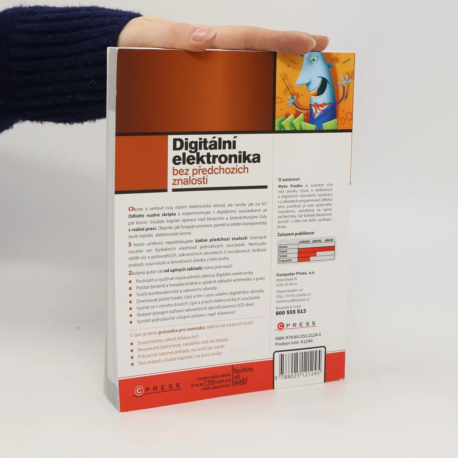 Chcete si sestavit svůj vlastní elektronický obvod, ale nevíte, jak na to? Odložte nudná skripta a experimentujte s digitálními součástkami za pár korun. Využijte logické operace nad binárními a šestnáctkovými čísly v reálné praxi. Objevte, jak funguje procesor, paměť a ostatní komponenty na té nejnižší, elektronické úrovni. S touto učebnicí nepotřebujete žádné předchozí znalosti číselných soustav ani fyzikálních vlastností jednotlivých součástek. Nemusíte vědět nic o polovodičích, sekvenčních obvodech či oscilátorech. Veškeré znalosti, souvislosti a dovednosti získáte z této knihy.
