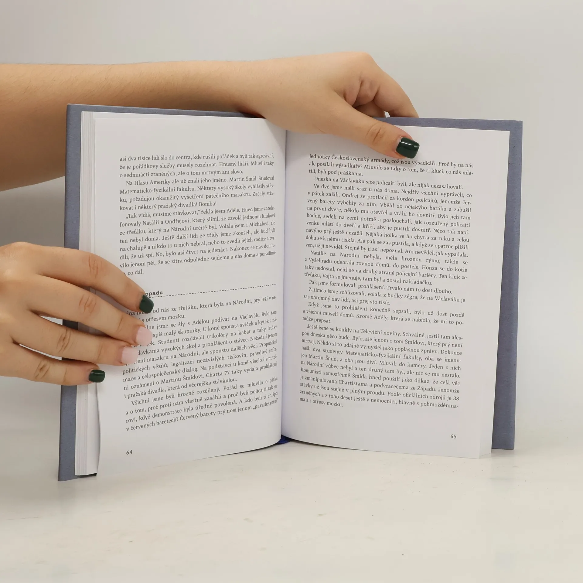 Československá socialistická republika, rok 1989. Magdaléně je čerstvých 17 let, chodí do 4.B na pražském gymnáziu, touží po lásce, ale ještě víc po tom žít ve svobodné zemi. Bojí se policejních obušků, ale přesto chodí demonstrovat a Václav Havel je jejím hrdinou. Pak přijde Sametová revoluce. “Máme holý ruce” je autentický deník studentky z doby převratu, ale zároveň i historický román, ve kterém jsou popsány události tak, jak se skutečně staly.