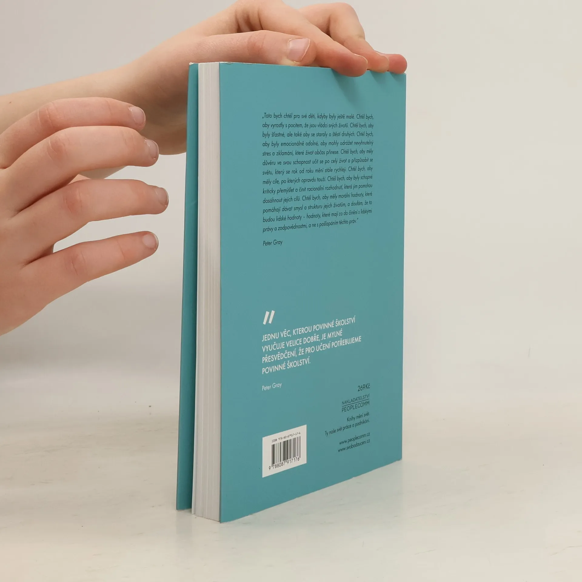 Druhé, zásadně rozšířené vydání knihy, která vznikla překladem klíčových textů z blogu Freedom to Learn. V dvaceti sedmi kapitolách americký profesor psychologie ukazuje, jak nepostradatelná je svoboda učení pro opravdové vzdělávání a harmonický rozvoj lidí a společnosti. Vede nás cestou od vzdělávání v lovecko-sběračských společenstvích, přes vzdělávání malých dětí až po školu v Sudbury Valley, která funguje na dokonale demokratických principech a na které nejsou učitelé. Celou knihou se táhne jako základní motto: Opravdové vzdělávání může fungovat jenom v atmosféře důvěry a svobody. Opravdová reforma vzdělávání nastane jen tehdy, když dostatečné množství lidí opustí tradiční školství. Kniha je ve svých východiscích i závěrech hluboce pravdivá a měl by jí číst každý, kdo se zajímá o vzdělávání dětí a jeho problémy.