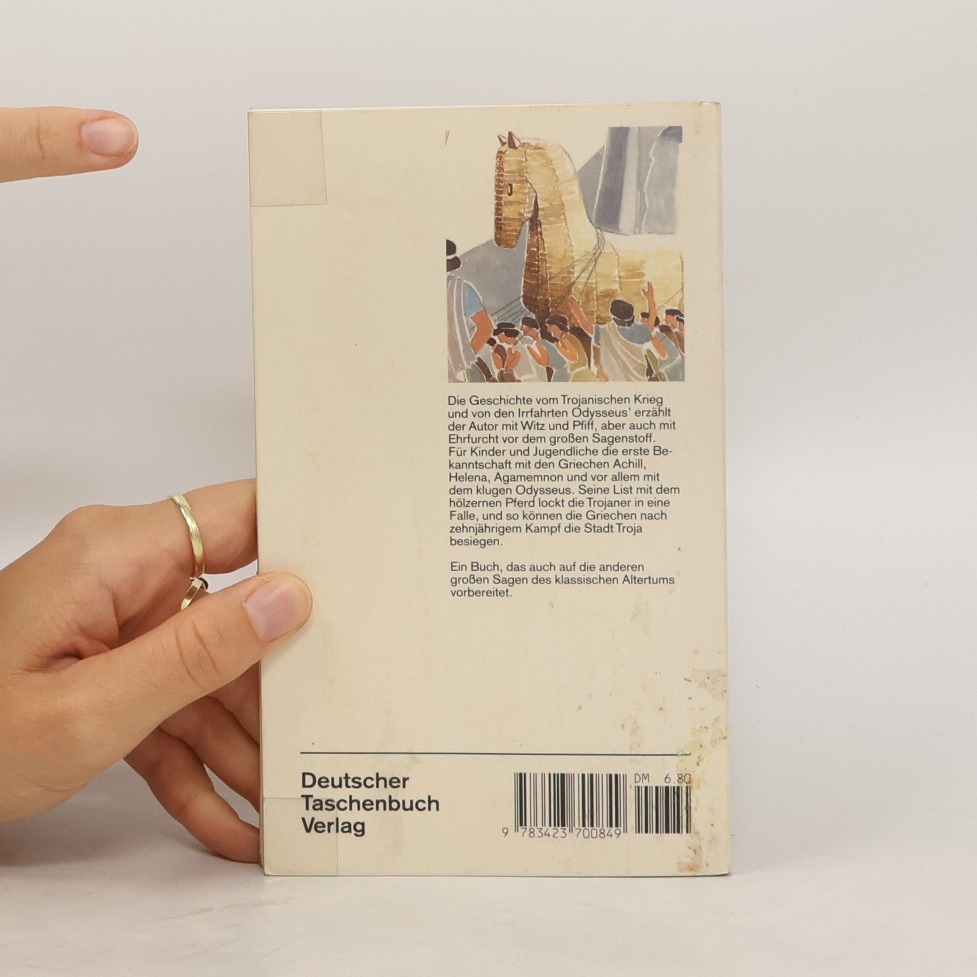 Die Geschichte vom Trojanischen Krieg und von den Irrfahrten des Odysseus erzählt der Autor mit Witz und Pfiff, aber auch mit Ehrfurcht vor dem großen Sagenstoff. Für Kinder und Jugendliche die erste Bekanntschaft mit den Griechen Achill, Helena, Agamemnon und vor allem mit dem klugen Odysseus. Seine List mit dem hölzernen Pferd lockt die Trojaner in eine Falle und so können die Griechen nach zehnjährigem Kampf die Stadt Troja besiegen.