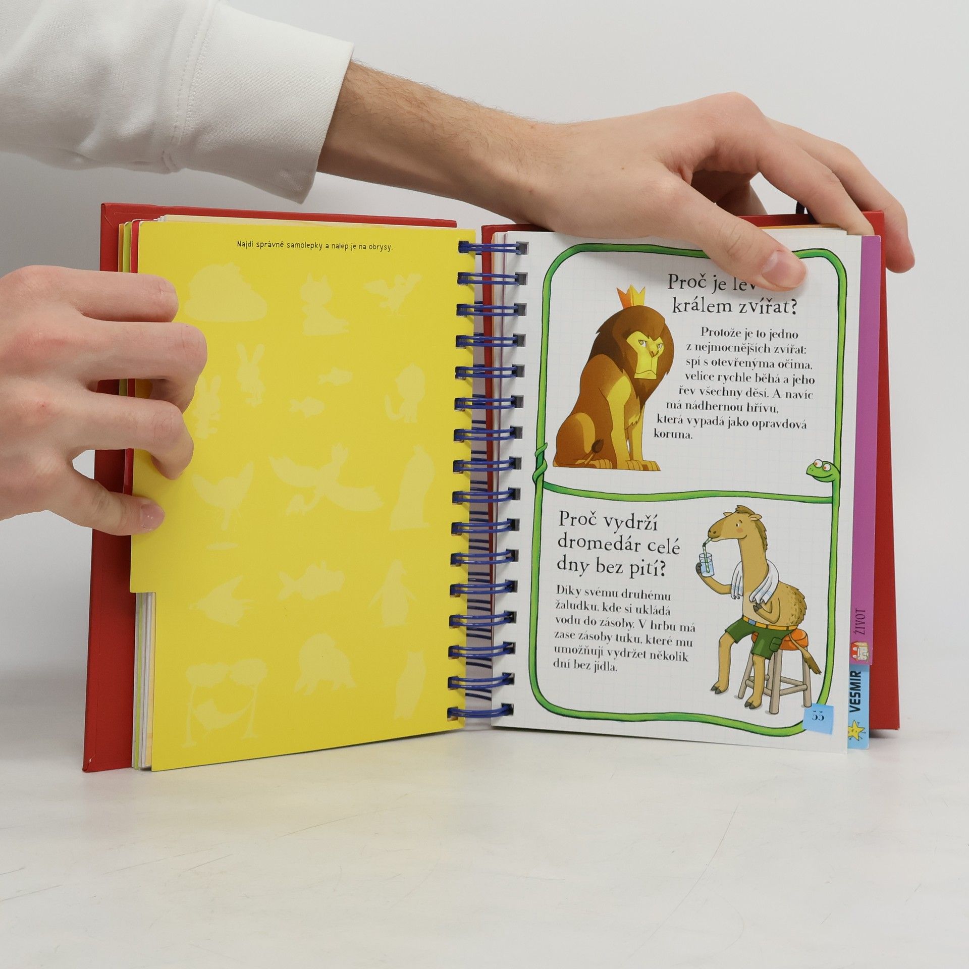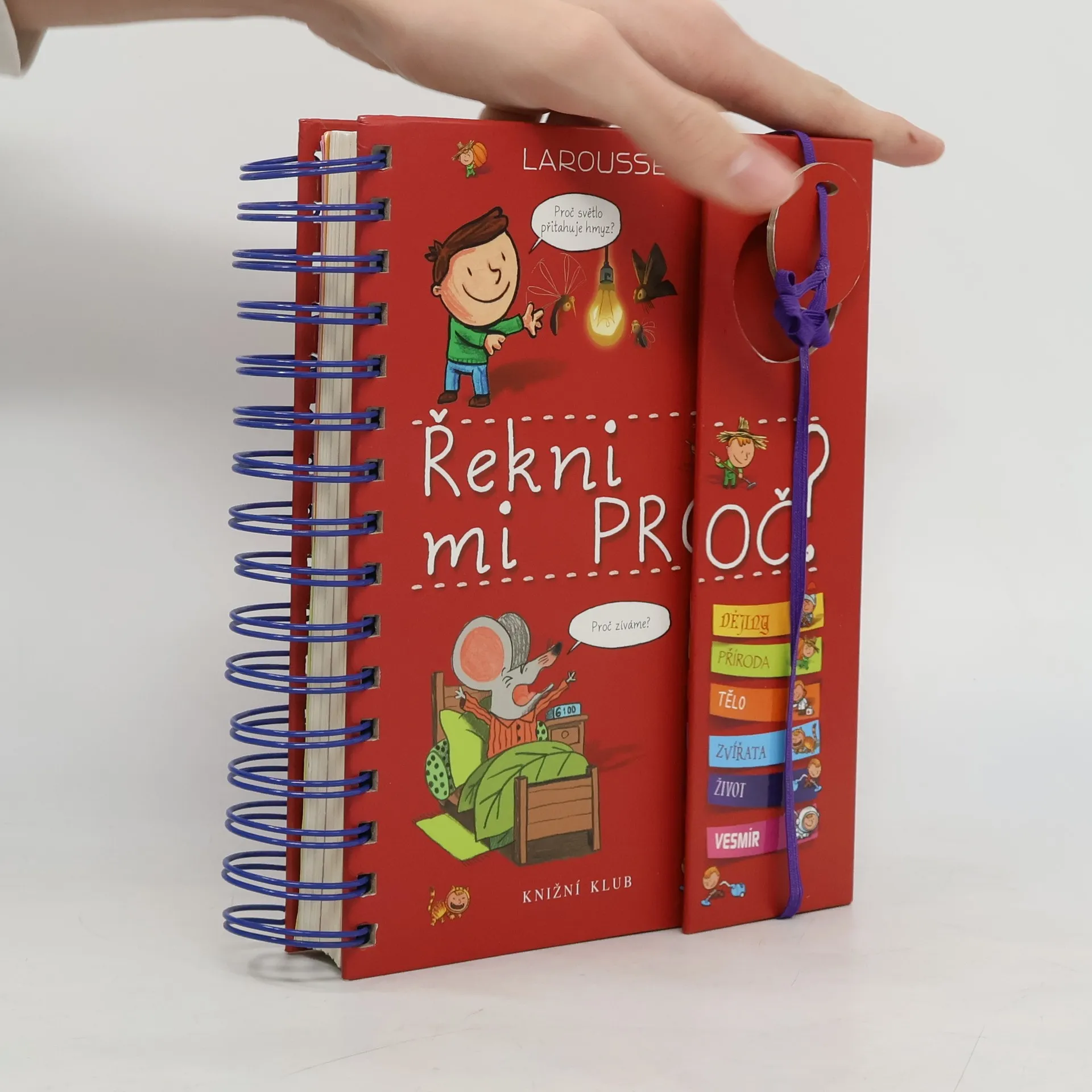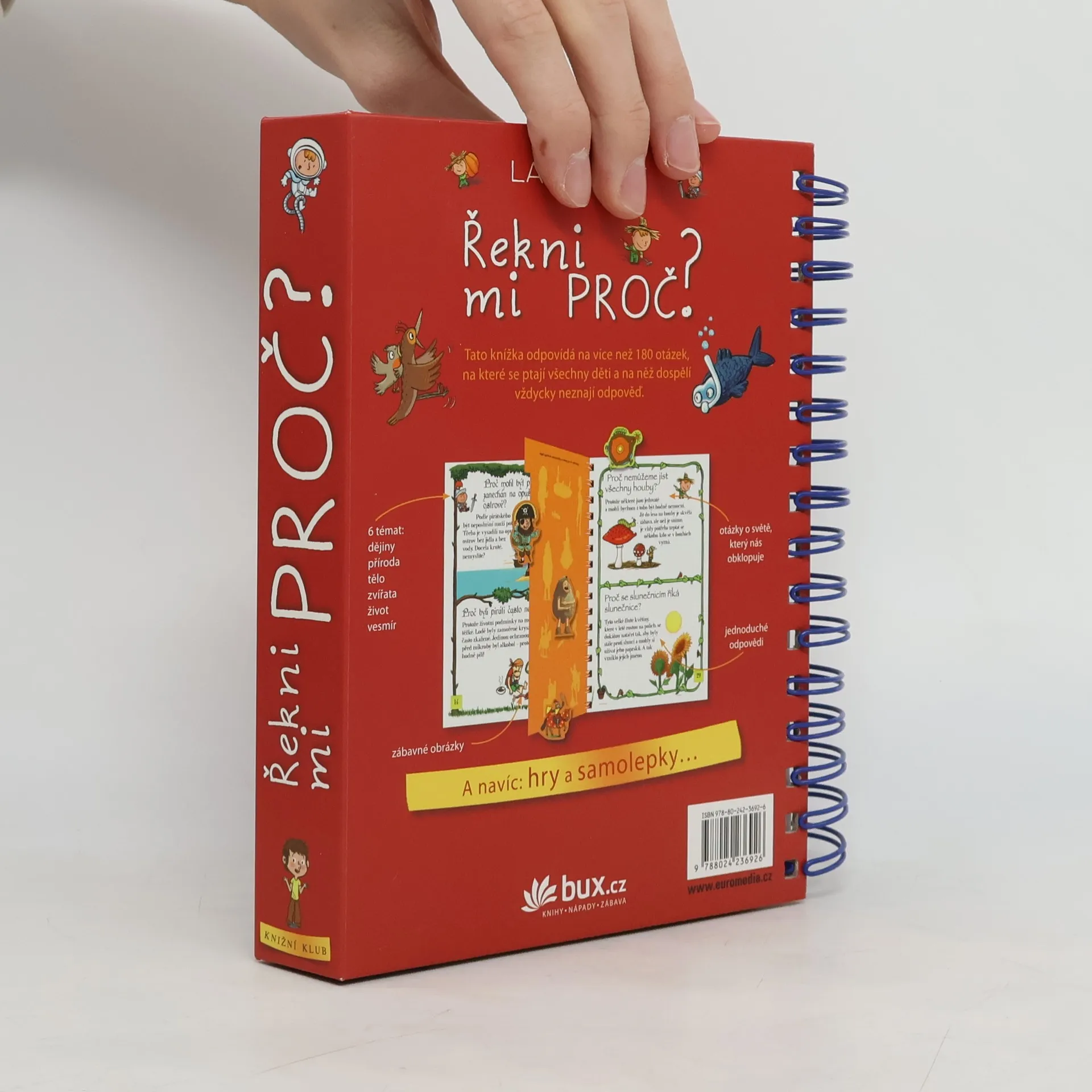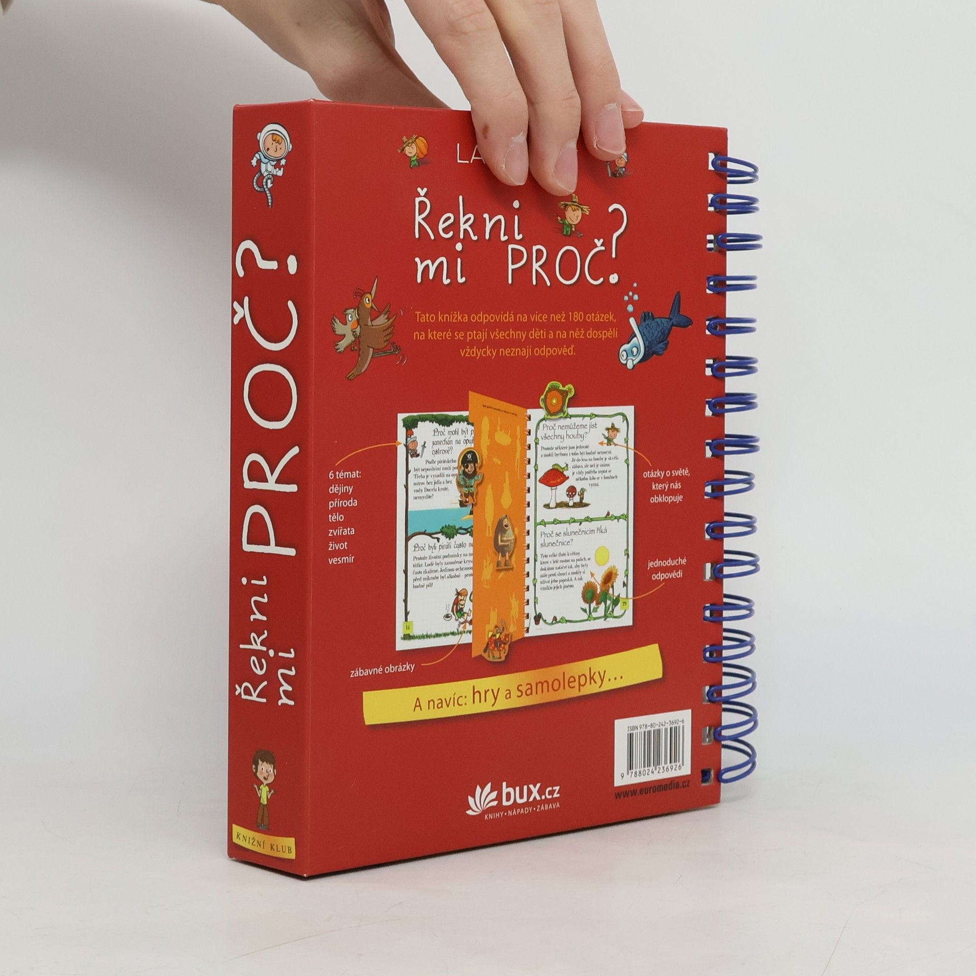 Knížka v kroužkové vazbě má 118 stránek a nacházejí se v ní odpovědi na 180 běžných dětských otázek. Jsou seřazené podle témat do šesti oblastí: dějiny, příroda, lidské tělo, zvířata, život a vesmír. Dozvíte se například, proč je nebe modré, proč Egypťané stavěli pyramidy, proč chodíme do školy, proč se potíme, proč kočky předou a spoustu, spoustu dalšího. Každou tematickou kapitolu navíc doplňují kvízy a samolepky.