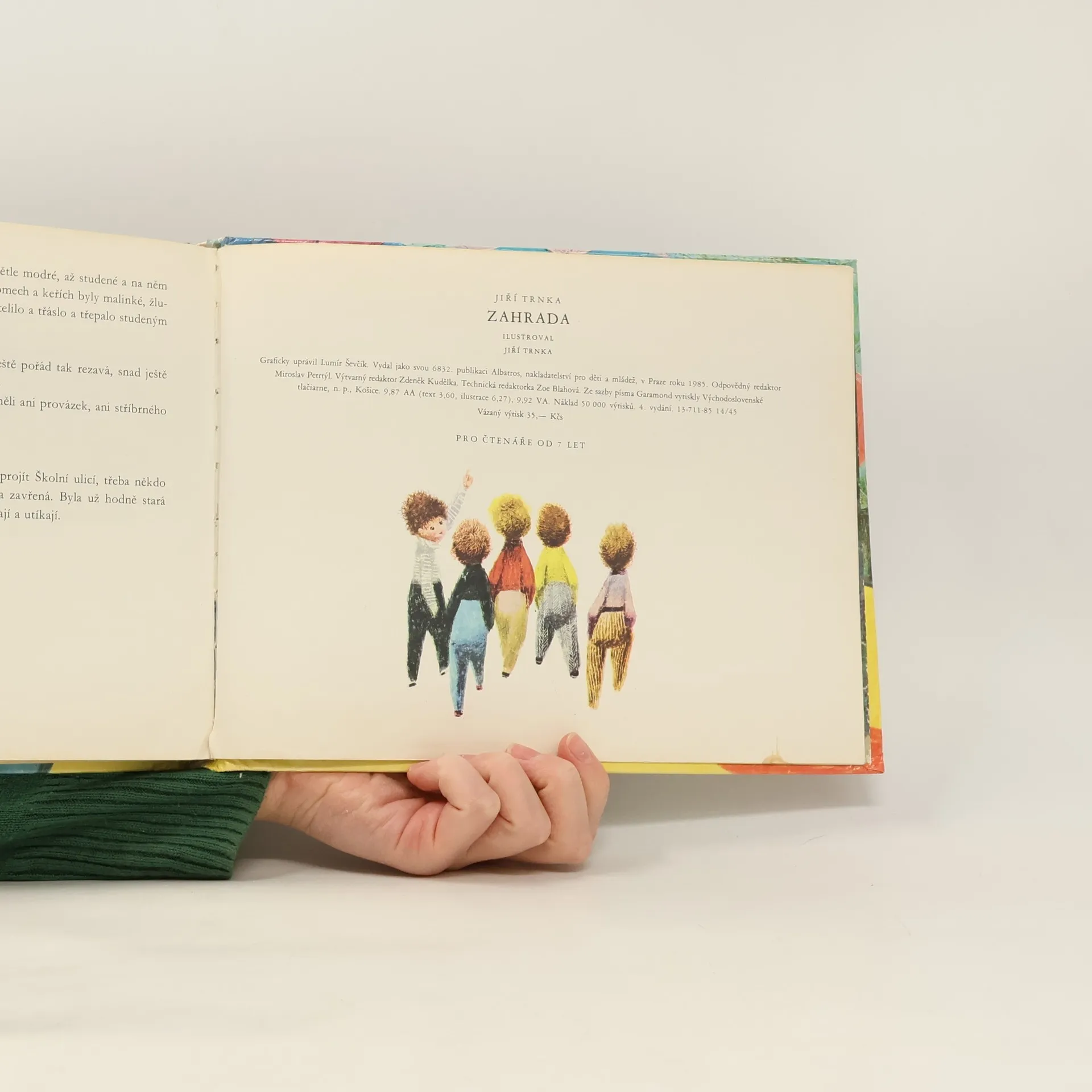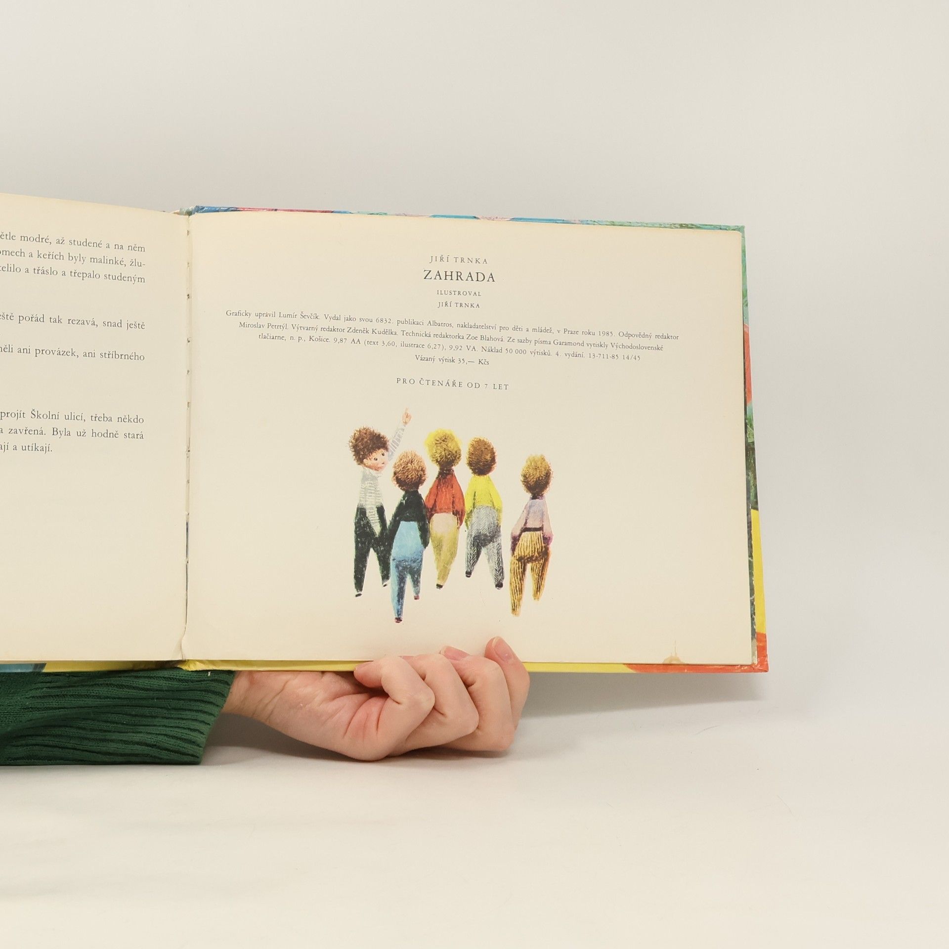 Zahrada Jiřího Trnky patří mezi díla, která léta oslovují děti i dospělé. Má své kouzlo, poezii i humor. Pohádku Trnka nejen ilustroval, ale sám i napsal. Pět kluků otevře starou rozvrzanou branku a vejdou do krásné, tajemné zahrady, kde potkají kamenného trpaslíka, zlomyslného kocoura, učenou velrybu, pět slonů, a odhalují rozličná tajemství. Kouzelný příběh, který známe i z filmového zpracování, je nezapomenutelný.