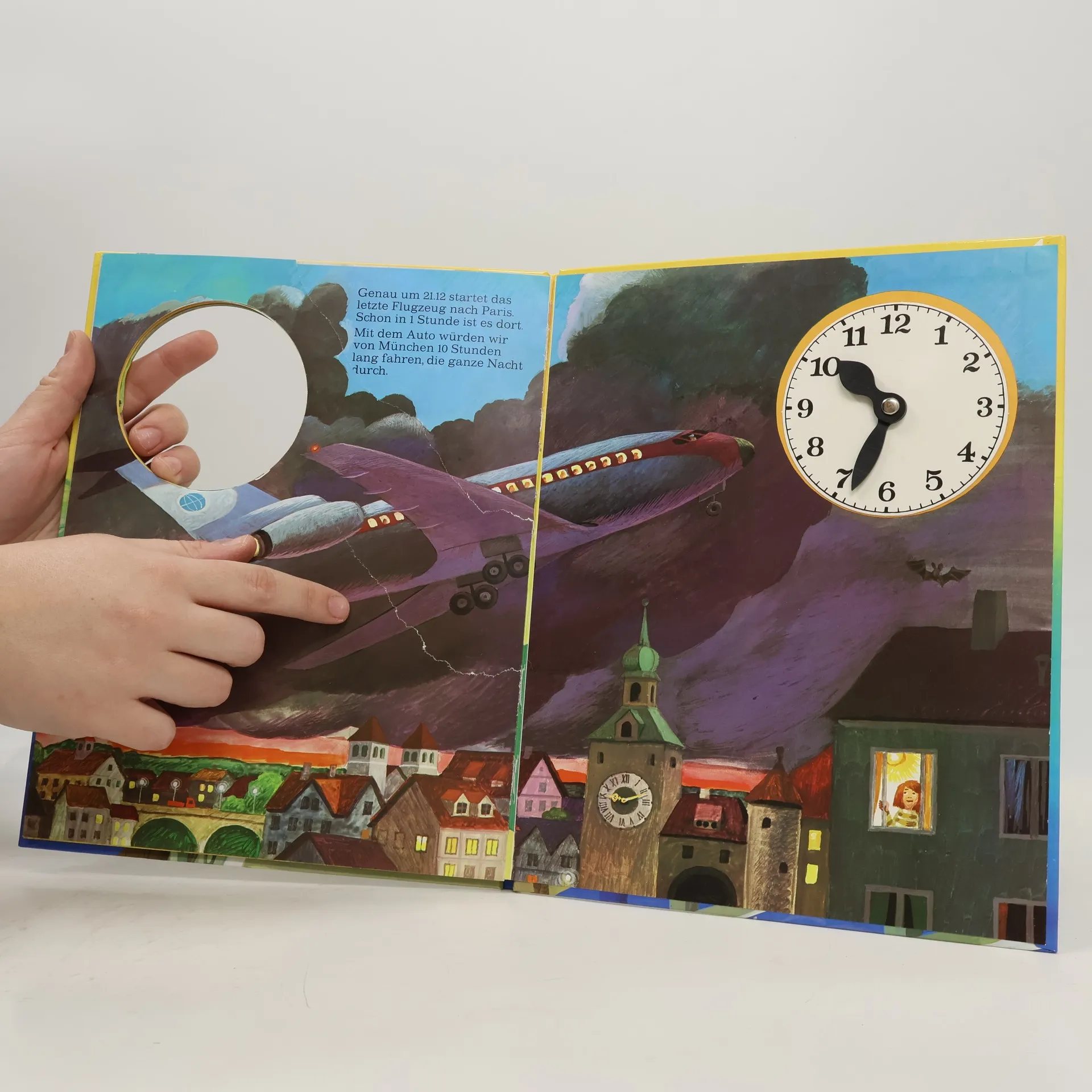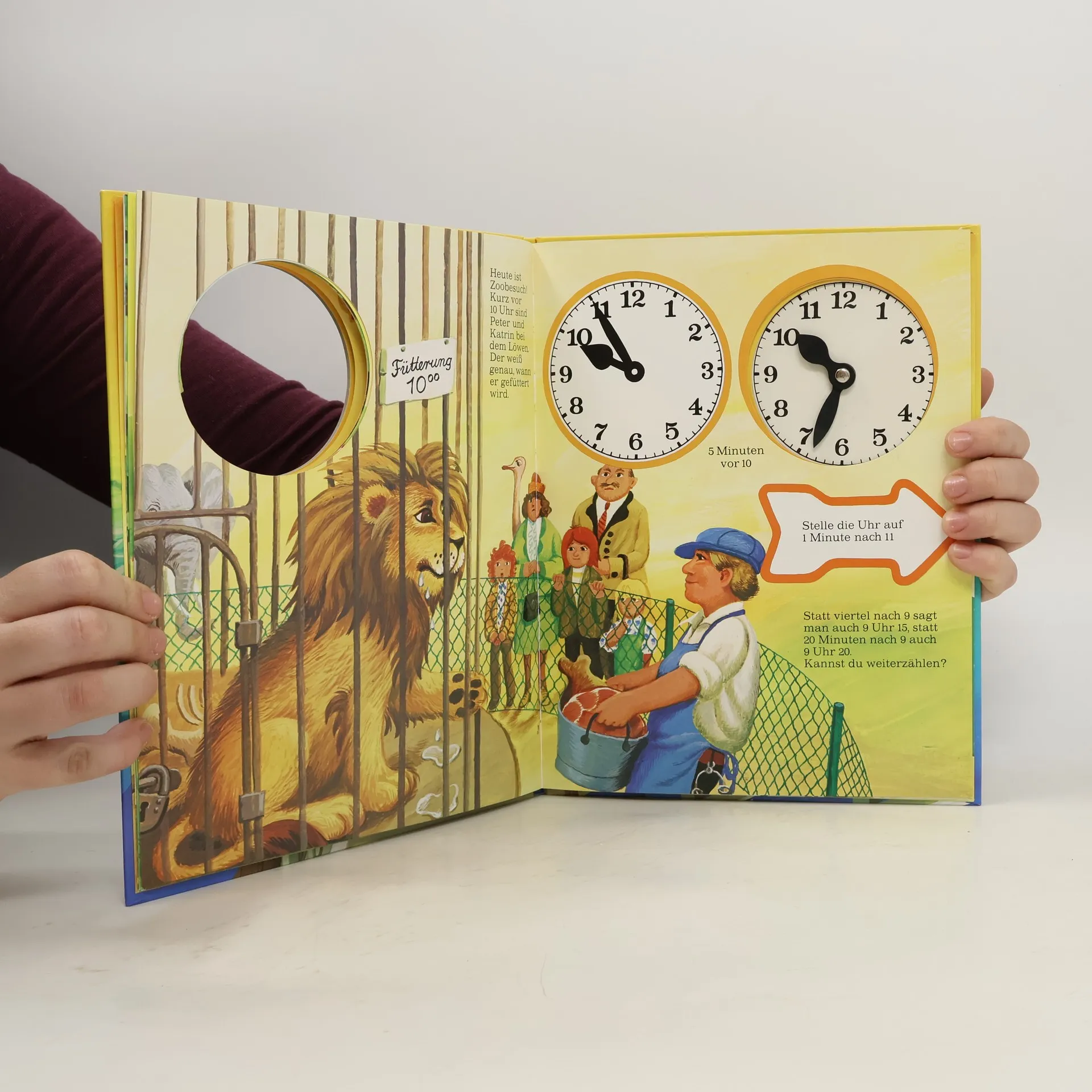 In Peters Tageslauf hat alles seine Zeit. Die kann man auf der ausgestanzten Uhr mit den drehbaren Zeigern einstellen.