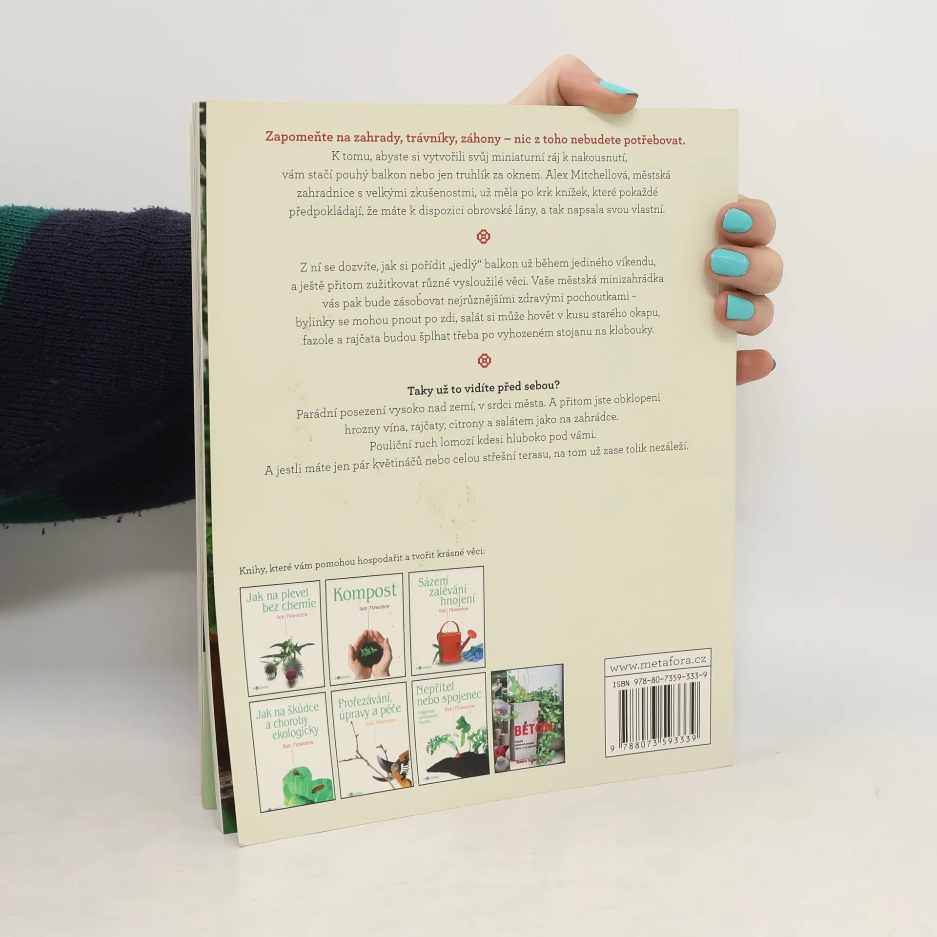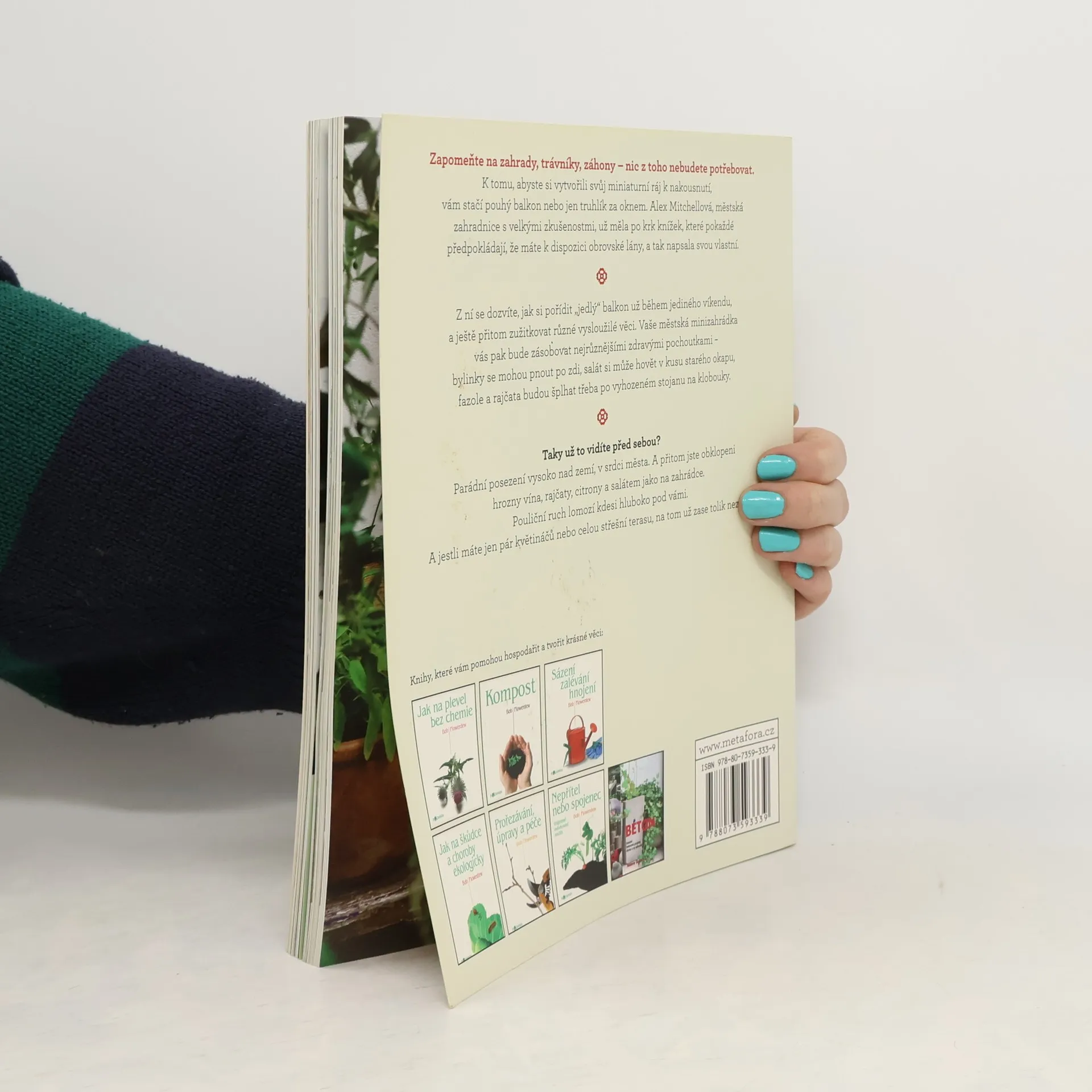 Jak vypěstovat čerstvé ovoce a zeleninu v srdci města… Zapomeňte na zahrady, trávníky, záhony – nic z toho nebudete potřebovat. K tomu, abyste si vytvořili svůj miniaturní ráj k nakousnutí, vám stačí pouhý balkon nebo jen truhlík za oknem. Alex Mitchellová, městská zahradnice s velkými zkušenostmi, už měla po krk knížek, které pokaždé předpokládají, že máte k dispozici obrovské lány, a tak napsala svou vlastní. Z ní se dozvíte, jak si pořídit „jedlý“ balkon už během jediného víkendu, a ještě přitom zužitkovat různé vysloužilé věci. Vaše městská minizahrádka vás pak bude zásobovat nejrůznějšími zdravými pochoutkami – bylinky se mohou pnout po zdi, salát si může hovět v kusu starého okapu, fazole a rajčata budou šplhat třeba po vyhozeném stojanu na klobouky. Taky už to vidíte před sebou? Parádní posezení vysoko nad zemí, v srdci města, a přitom jste obklopeni hrozny vína, rajčaty, citrony a salátem jako na zahrádce. Pouliční ruch lomozí kdesi hluboko pod vámi. A jestli máte jen pár květináčů nebo celou střešní terasu, na tom už zase tolik nezáleží.