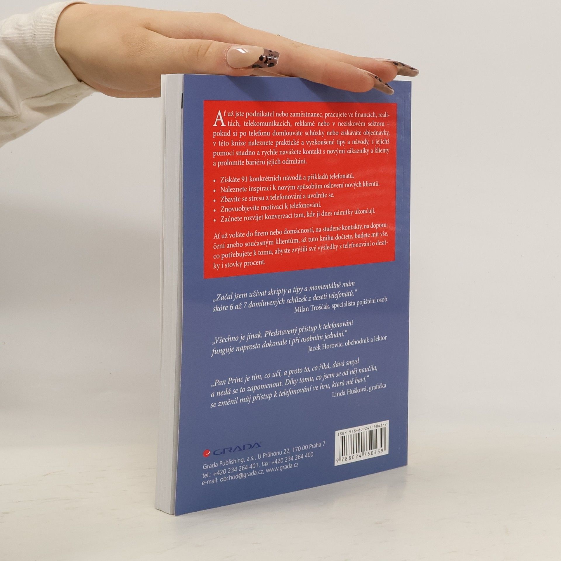 Ať už jste podnikatel nebo zaměstnanec, pracujete ve financích, realitách, telekomunikacích, reklamě nebo v neziskovém sektoru – pokud si po telefonu domlouváte schůzky nebo získáváte objednávky, v této knize naleznete praktické a vyzkoušené tipy a návody, s jejichž pomocí snadno a rychle navážete kontakt s novými zákazníky a klienty a prolomíte bariéru jejich odmítání. * Získáte 91 konkrétních návodů a příkladů telefonátů. * Naleznete inspiraci k novým způsobům oslovení nových klientů. * Zbavíte se stresu z telefonování a uvolníte se. * Znovuobjevíte motivaci k telefonování. * Začnete rozvíjet konverzaci tam, kde ji dnes námitky ukončují. Ať už voláte do firem nebo domácností, na studené kontakty, na doporučení anebo současným klientům, až tuto knihu dočtete, budete mít vše, co potřebujete k tomu, abyste zvýšili své výsledky z telefonování o desítky i stovky procent.