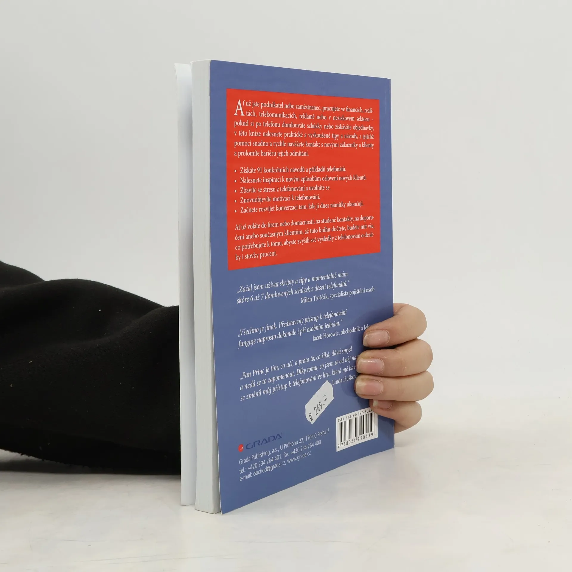 Ať už jste podnikatel nebo zaměstnanec, pracujete ve financích, realitách, telekomunikacích, reklamě nebo v neziskovém sektoru – pokud si po telefonu domlouváte schůzky nebo získáváte objednávky, v této knize naleznete praktické a vyzkoušené tipy a návody, s jejichž pomocí snadno a rychle navážete kontakt s novými zákazníky a klienty a prolomíte bariéru jejich odmítání. * Získáte 91 konkrétních návodů a příkladů telefonátů. * Naleznete inspiraci k novým způsobům oslovení nových klientů. * Zbavíte se stresu z telefonování a uvolníte se. * Znovuobjevíte motivaci k telefonování. * Začnete rozvíjet konverzaci tam, kde ji dnes námitky ukončují. Ať už voláte do firem nebo domácností, na studené kontakty, na doporučení anebo současným klientům, až tuto knihu dočtete, budete mít vše, co potřebujete k tomu, abyste zvýšili své výsledky z telefonování o desítky i stovky procent.