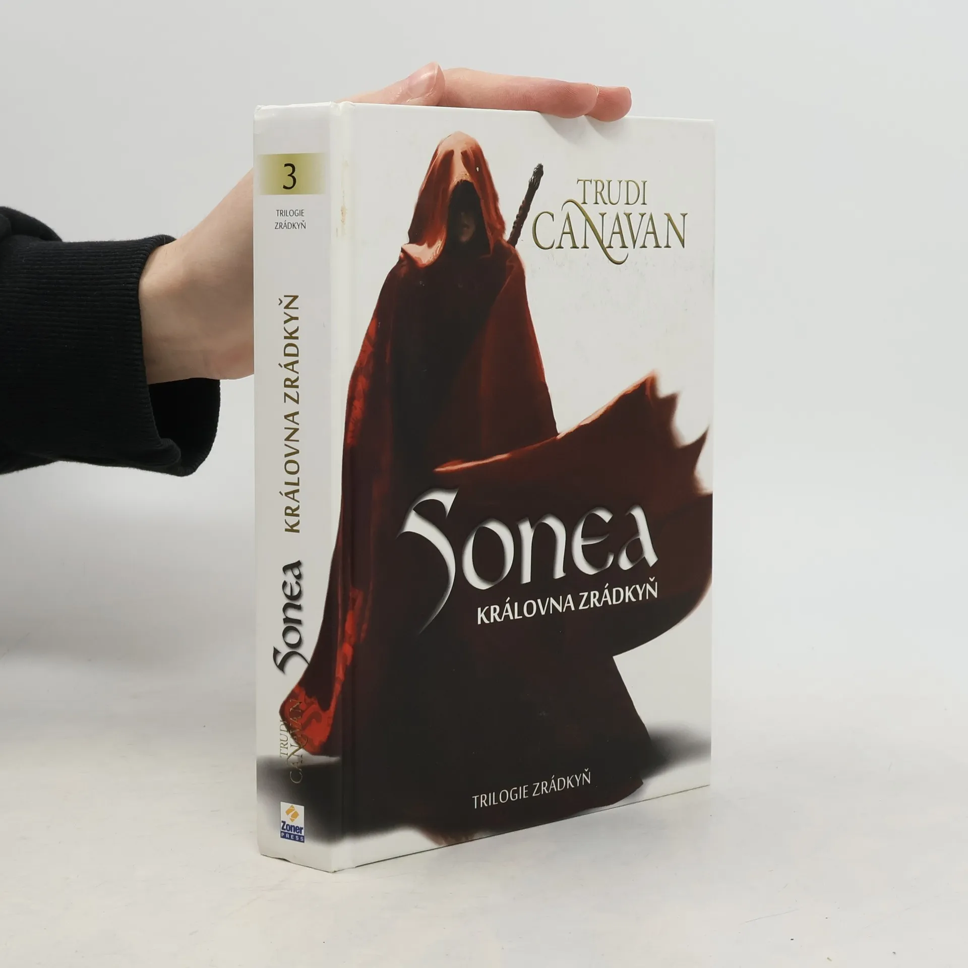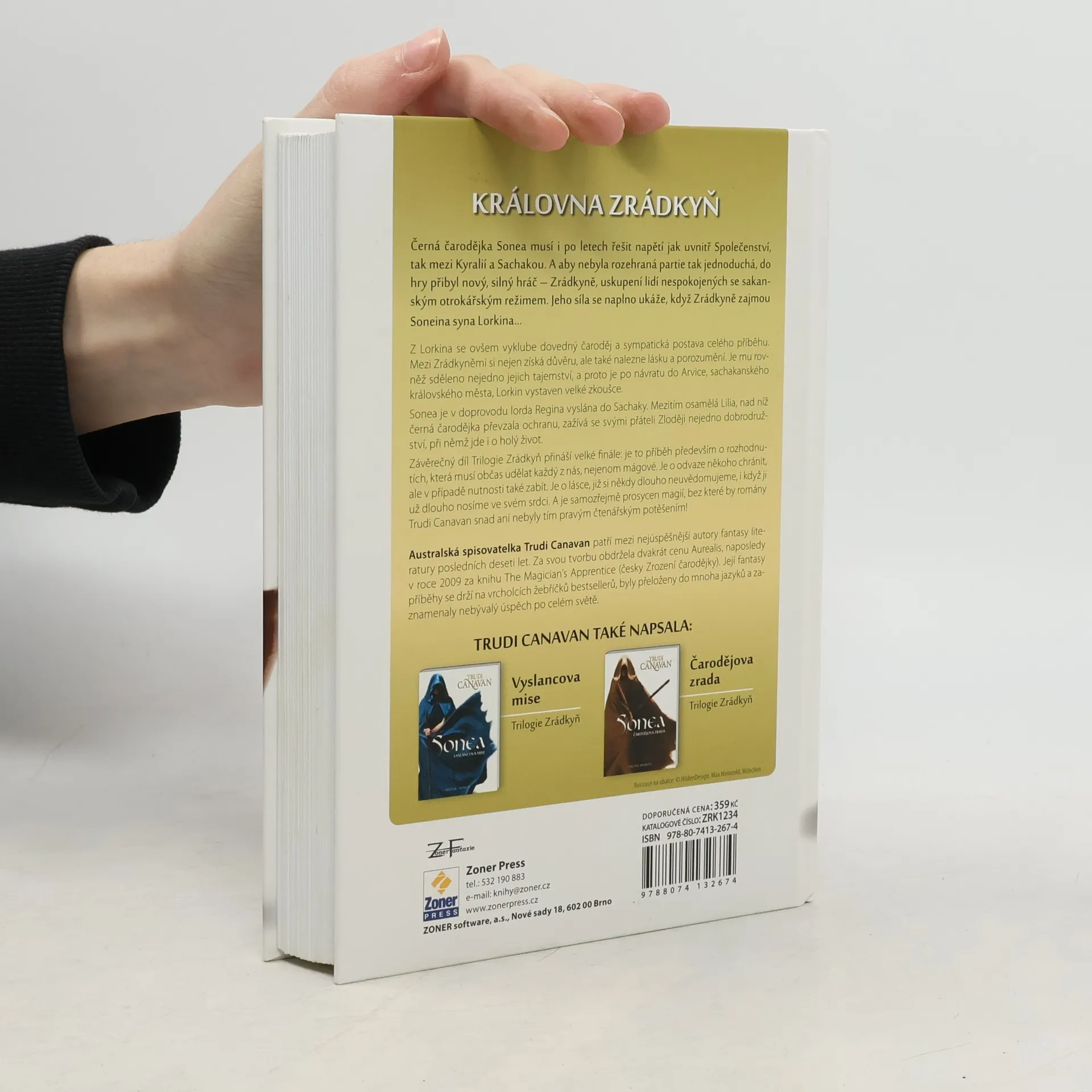 Série knih o černé čarodějce Sonee se uzavírá ve velkém finále! Sonea nemá ani po dvaceti letech od velké bitvy klid. Vztahy mezi Kyralií a Sachakou jsou napjaté, do toho musí hlavní hrdinka řešit své vlastní problémy. Jejího syna Lorkina po návratu od Zrádkyň zajal sachakanský král a Sonea se po letech opět vydává do míst, která jí před lety naprosto změnila život. Zrádkyně se rozhodnou vsadit vše na jednu kartu a v Sachace propukne velká řež. Ovšem vře to i v Kyralii. Podsvětí ovládá zbloudilý čaroděk, který se nezalekne ničeho. Nastávají boje na život a na smrt, které se neobejdou bez mnoha obětí. Třetí díl Trilogie Zrádkyň uzavírá sérii příběhů o Společenství, Sonee a jejích blízkých. Nechybí napínavé zvraty ani děj prodchnutý magií. Sonea: Královna Zrádkyň je zároveň příběhem o odhodlání, odvaze a lásce – ať už mateřské nebo takové, která se objeví ve chvíli, kdy ji člověk čeká nejméně. Trudi Canavan, známá australská spisovatelka, patří mezi nejoblíbenější fantasy autorky posledních deseti let. Její knihy byly přeloženy do mnoha jazyků a staly se světovým bestsellerem. Obě trilogie o Sonee – Trilogie o černém mágovi a Trilogie Zrádkyň – vyšly v překladu v nakladatelství Zoner Press a zaznamenaly nemalý úspěch i u českých čtenářů.