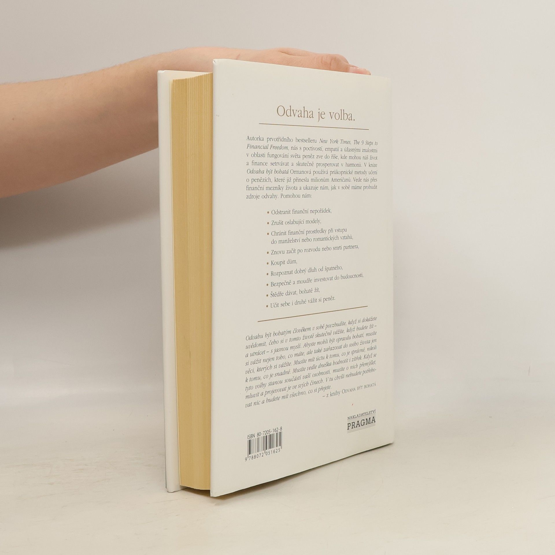 Co byste potřebovali k tomu, abyste mohli změnit průběh svého života? Abyste se cítili bohatí ve všech možných směrech, ve svých finančních výsledcích, ale také ve svém srdci, duši, v tom, jak každý den žijete? Odpověď zní - odvahu. Vynikající spisovatelka a finanční expertka Suze Ormanová pomohla milionům Američanů obrátit pozornost k penězům a nastoupit cestu k bohatství. Vyzývá nás, abychom si uvědomili i skutečnost, že hodnotu života nelze měřit jen peněz,i a ukazuje, jak zapojit mysl a uplatnit bystrý úsudek, jak najít přesvědčení a odvahu setkat se s překážkami a příležitostmi, které nám život klade do cesty, a nabízí ve všech možných oblastech - od milostných záležitostí po koupi domu, od vštěpování správných hodnot dětem k definování naší vlastní sebeúcty, od opětných začátků k uplatňování nároku na budoucnost - cenné rady a návody. Autorka vyjadřuje své hluboké předsvědčení, že jen tehdy, když se skutečně naučíme vážit si peněz, dokážeme v tom nejširším smyslu změnit svůj finanční osud.