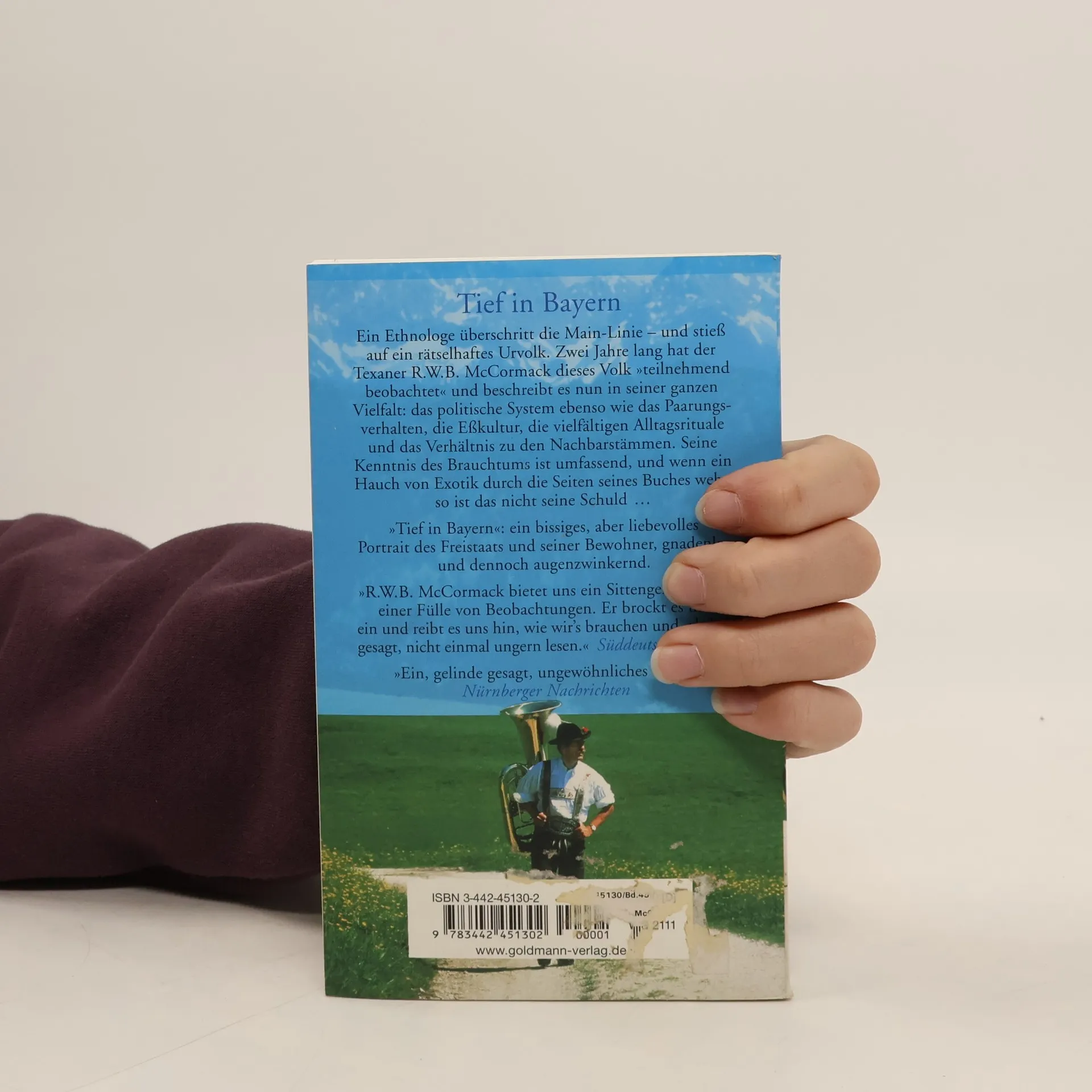 Um den einzigartigen deutschen Stamm der Bayern zu erforschen, muss man von weit her kommen, wie Professor R. W. B. McCormack aus Texas. Vielleicht ist es die besondere Affinität zwischen Bayern und Texanern, die ein tieferes Verständnis und Empathie fördert. Laut einer gehässigen Definition empfindet ein Bayer Freude daran, Fremden den falschen Weg zum Hofbräuhaus zu zeigen. McCormack nutzt moderne Kulturanthropologie, um den Bayern differenziert zu begegnen und beschreibt ihr Leben in seiner ganzen Vielfalt: von politischen Systemen über Paarungsverhalten und Esskultur bis hin zu Alltagsritualen und Nachbarschaftsbeziehungen. Sein umfassendes Wissen über Brauchtum zeigt, dass ein Hauch von Exotik nicht seine Schuld ist. Der Eindruck, er verfolge satirische Absichten, ist irreführend; er bleibt den Fakten treu. Diese belegen, dass die Bayern sich früh dem High-Tech-Denken geöffnet haben und dennoch auf ihre Weise Naturvolk geblieben sind. „Eine literarische Eulenspiegelei auf höchstem Niveau.“ – Volksblatt, Spandau „Ein, gelinde gesagt, ungewöhnliches Buch.“ – Nürnberger Nachrichten „In McCormacks mit zahlreichen Fotos und ironischen Kommentaren ausgestatteter Ethnographie wird mit Stereotypen und Pauschalierungen operiert, dass eher befreiendes Gelächter als Häme evoziert wird.“ – Der Standard, Wien