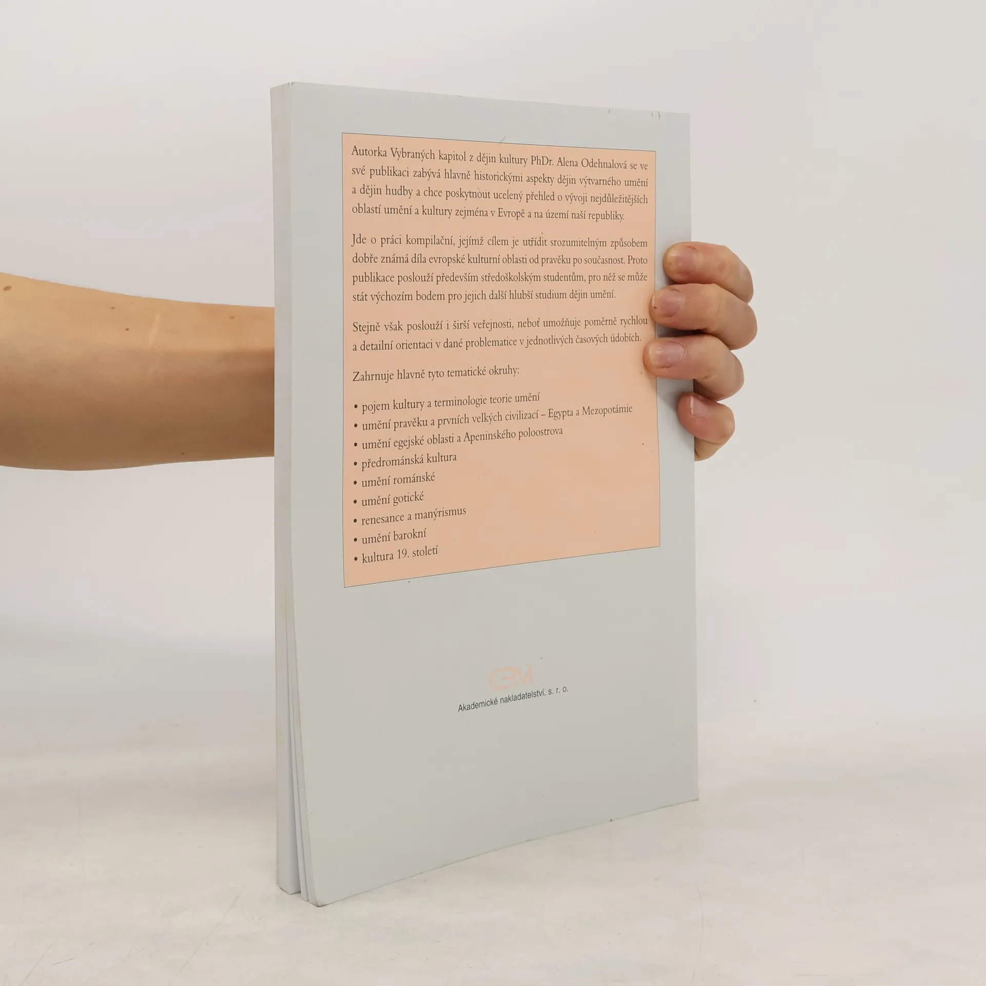 Autorka PhDr. Alena Odehnalová se ve své publikaci zabývá hlavně historickými aspekty dějin výtvarného umění a dějin hudby a chce poskytnout ucelený přehled o vývoji nejdůležitějších oblastí umění a kultury zejména v Evropě a na území ČR.