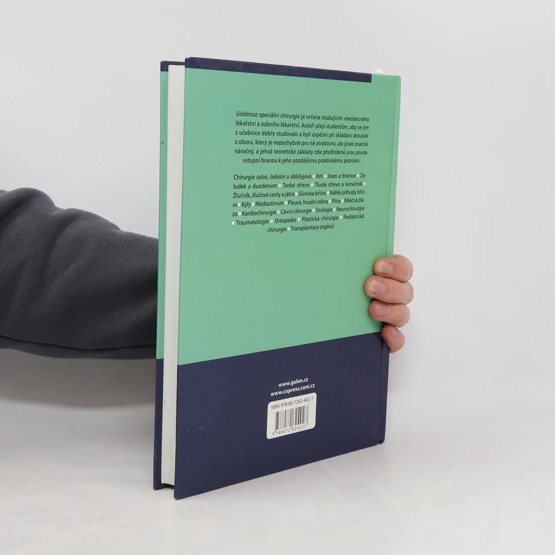 Nová celostátní učebnice určená pro studenty všeobecného i zubního lékařství přehledně seznamuje se základy speciální chirurgie. Je členěna podle jednotlivých subspecializací chirurgie (např. chirurgie ústní, čelistní a obličejová, kardiochirurgie, cévní chirurgie, neurochirurgie, traumatologie, plastická chirurgie, pediatrická chirurgie, transplantace orgánů), v závěru každé kapitoly jsou zařazeny kontrolní otázky k ověření znalostí.