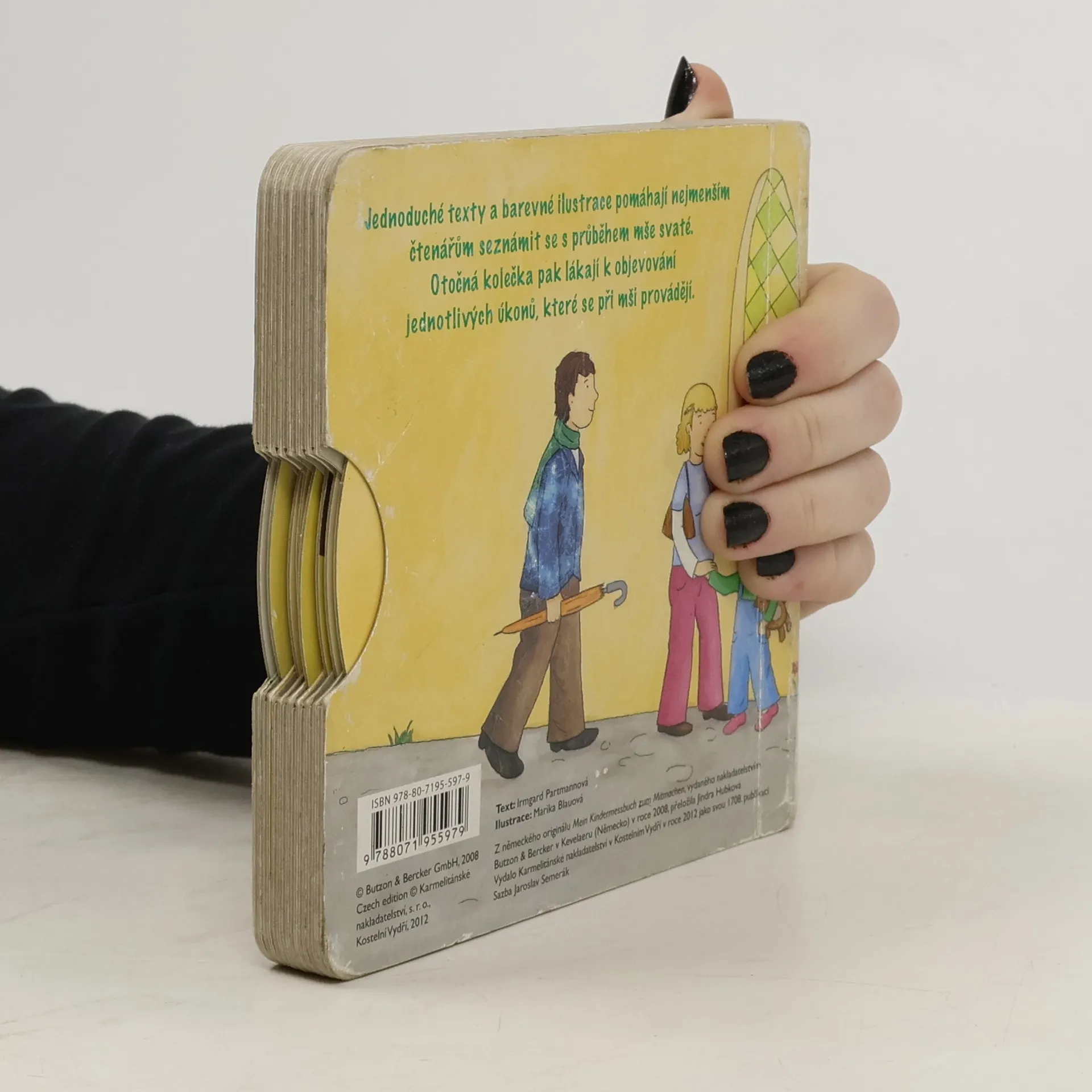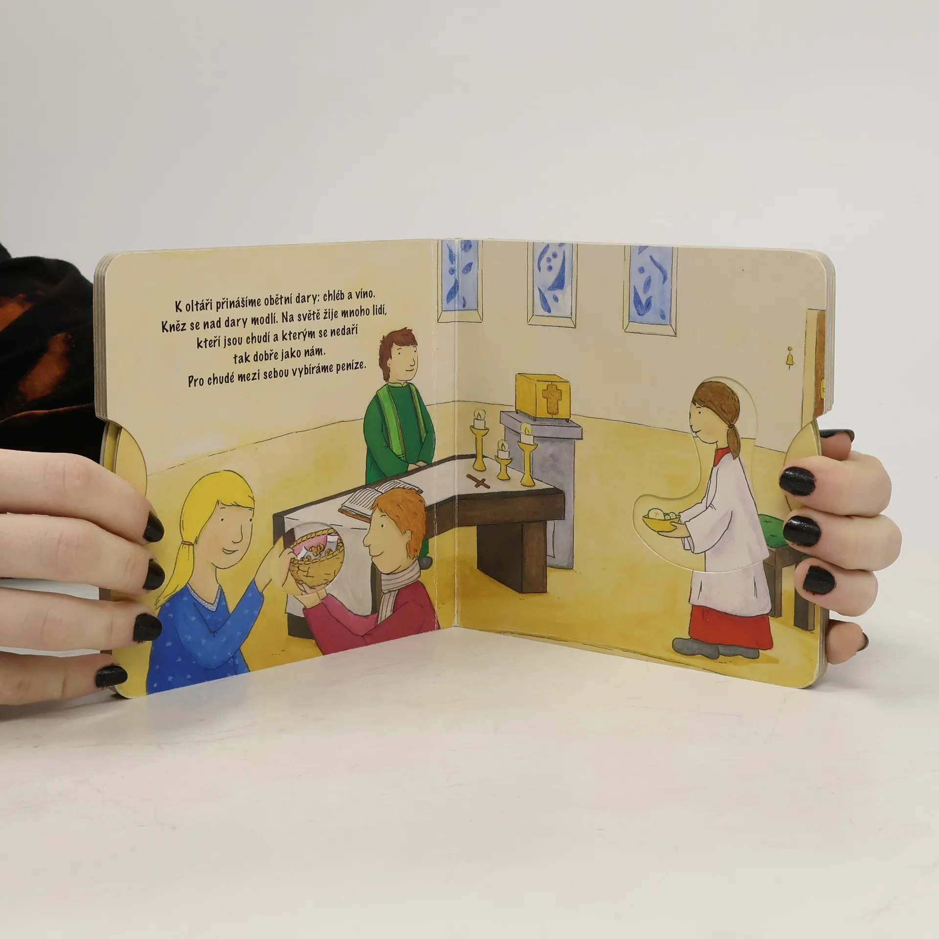 Jednoduché texty a barevné ilustrace pomáhají nejmenším čtenářům seznámit se s průběhem mše svaté. Otočná kolečka pak lákají k objevování jednotlivých úkonů, které se při mši provádějí. leporelo