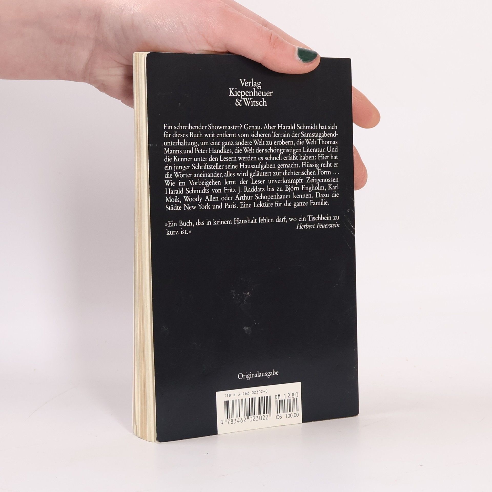 Ein schreibender Talkmaster? Genau. Aber Harald Schmidt war bei diesem Buch noch weit entfernt vom sicheren Terrain seiner allabendlichen Late-Night-Show und eroberte eine ganz andere Welt, die Welt Thomas Manns und Peter Handkes, die Welt der schöngeistigen Literatur. Die Kenner unter den Lesern werden es schnell erfassen: Hier hat ein junger Schriftsteller seine Hausaufgaben gemacht. Flüssig reiht er die Wörter aneinander, alles wird geläutert zu dichterischer Form. Man wird fragen: Haben wir es mit einer zarten Novelle zu tun? Mit einem scharfsinnigen Essay oder einfach mit einer schnörkellosen Prosaarbeit? Die Antwort: Harald Schmidts erstes Buch ist ein Werk sui generis, ein nomadischer Text, der die bekannten Genres des Arzt- oder Heimatromans ebenso dekonstruiert wie – denn doch – die gängigen Formate der TV-Unterhaltung, des Schriftstellertagebuchs oder des pädagogisch gemeinten Sozialdramas. Wie im Vorbeigehen lernt der Leser unverkrampft Zeitgenossen Harald Schmidts von Fritz J. Raddatz bis zu Karl Moik, Woody Allen oder Arthur Schopenhauer kennen. Dazu die Städte New York und Paris. Eine Lektüre für die ganze Familie. „Ein Buch, das in keinem Haushalt fehlen darf, wo ein Tischbein zu kurz ist.“ Herbert Feuerstein