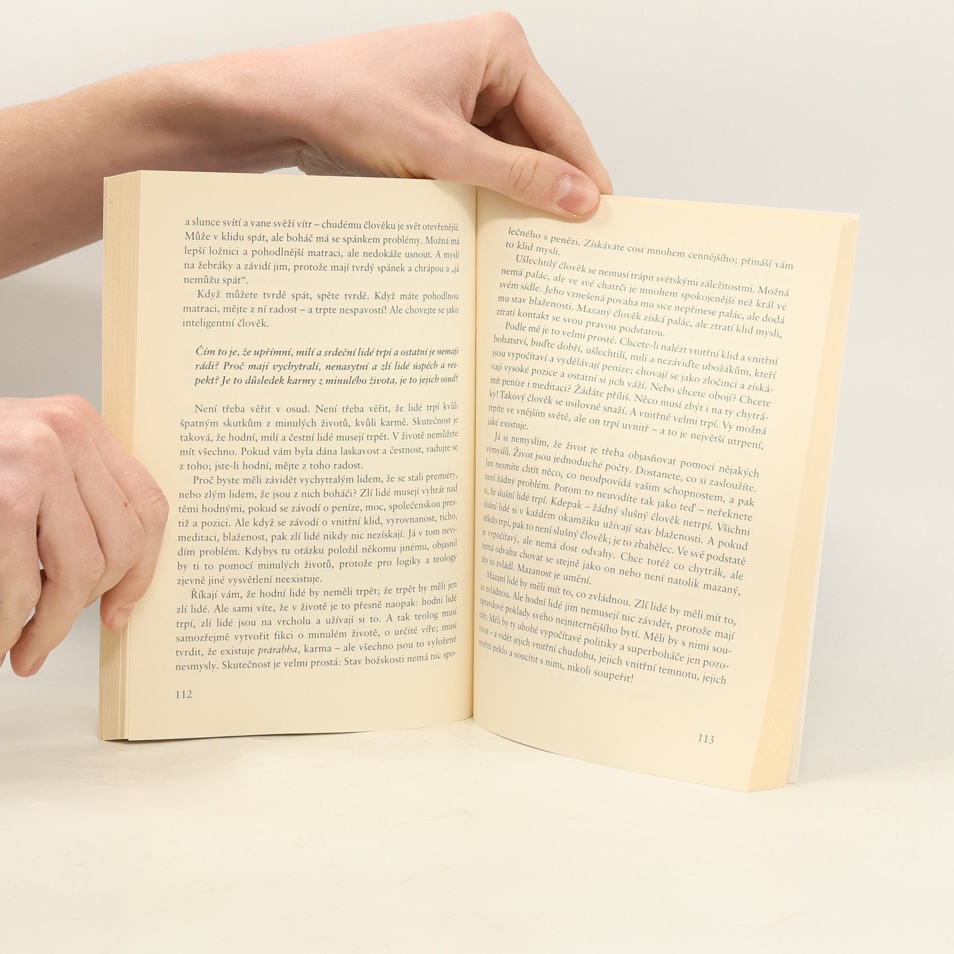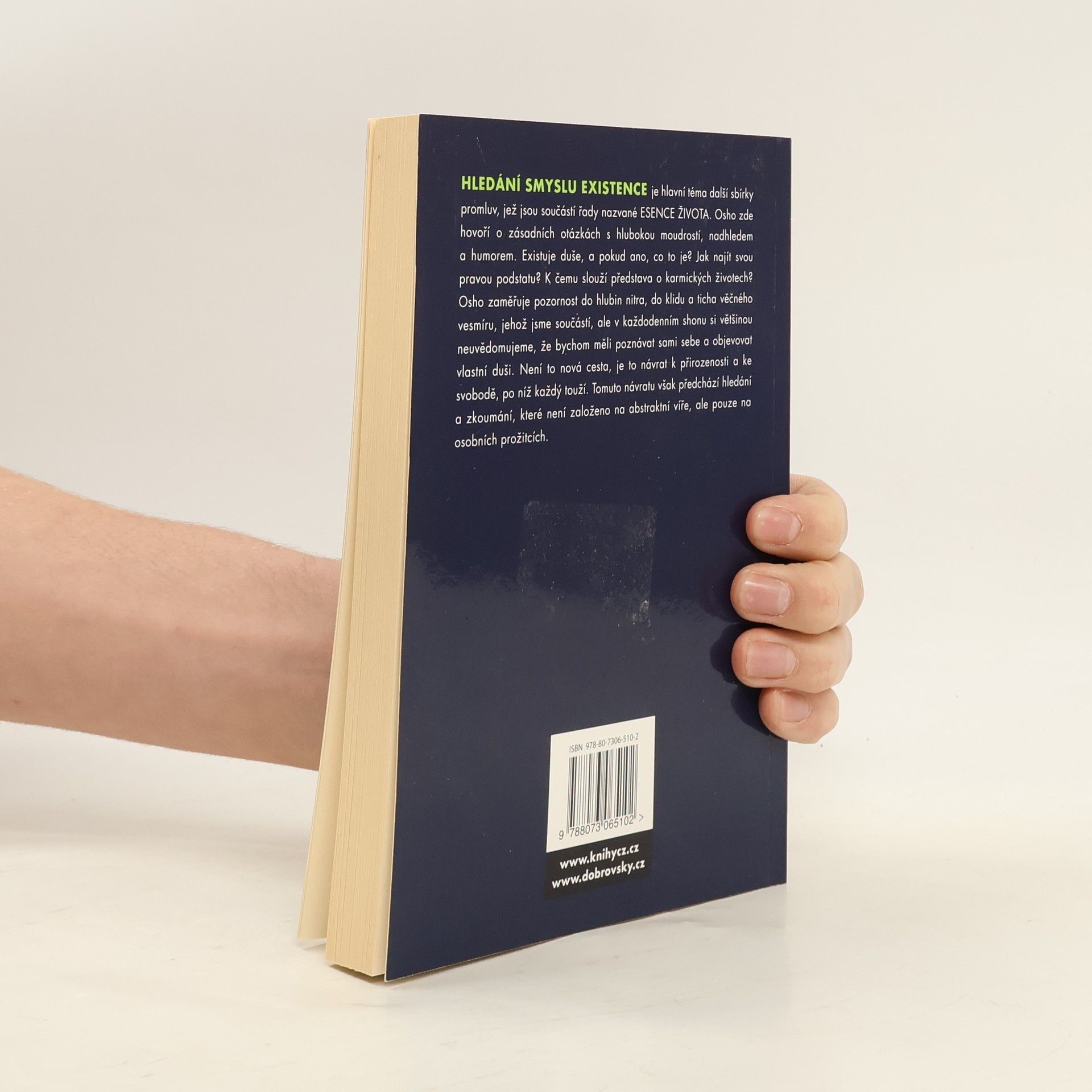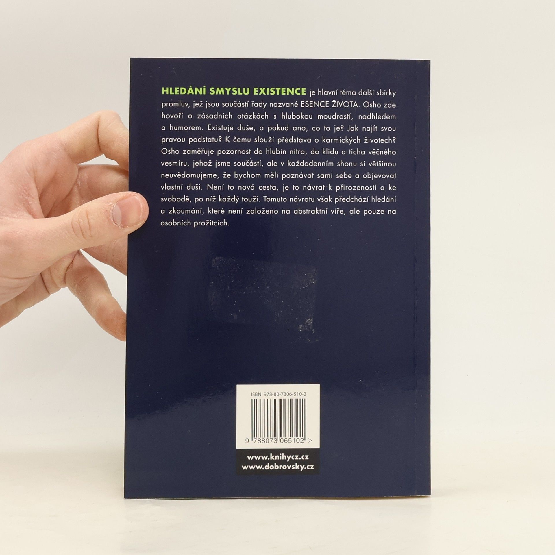 Hledání smyslu existence je hlavní téma další sbírky promluv, jež jsou součástí řady nazvané Esence života. Osho zde hovoří o zásadních otázkách s hlubokou moudrostí, nadhledem a humorem. Existuje duše, a pokud ano, co to je? Jak najít svou pravou podstatu? K čemu slouží představa o karmických životech? Osho zameřuje pozornost do hlubin nitra, do klidu a ticha věčného vesmíru, jehož jsme součástí, ale v každodenním shonu si většinou neuvědomujeme, že bychom měli poznávat sami sebe a objevovat vlastní duši.